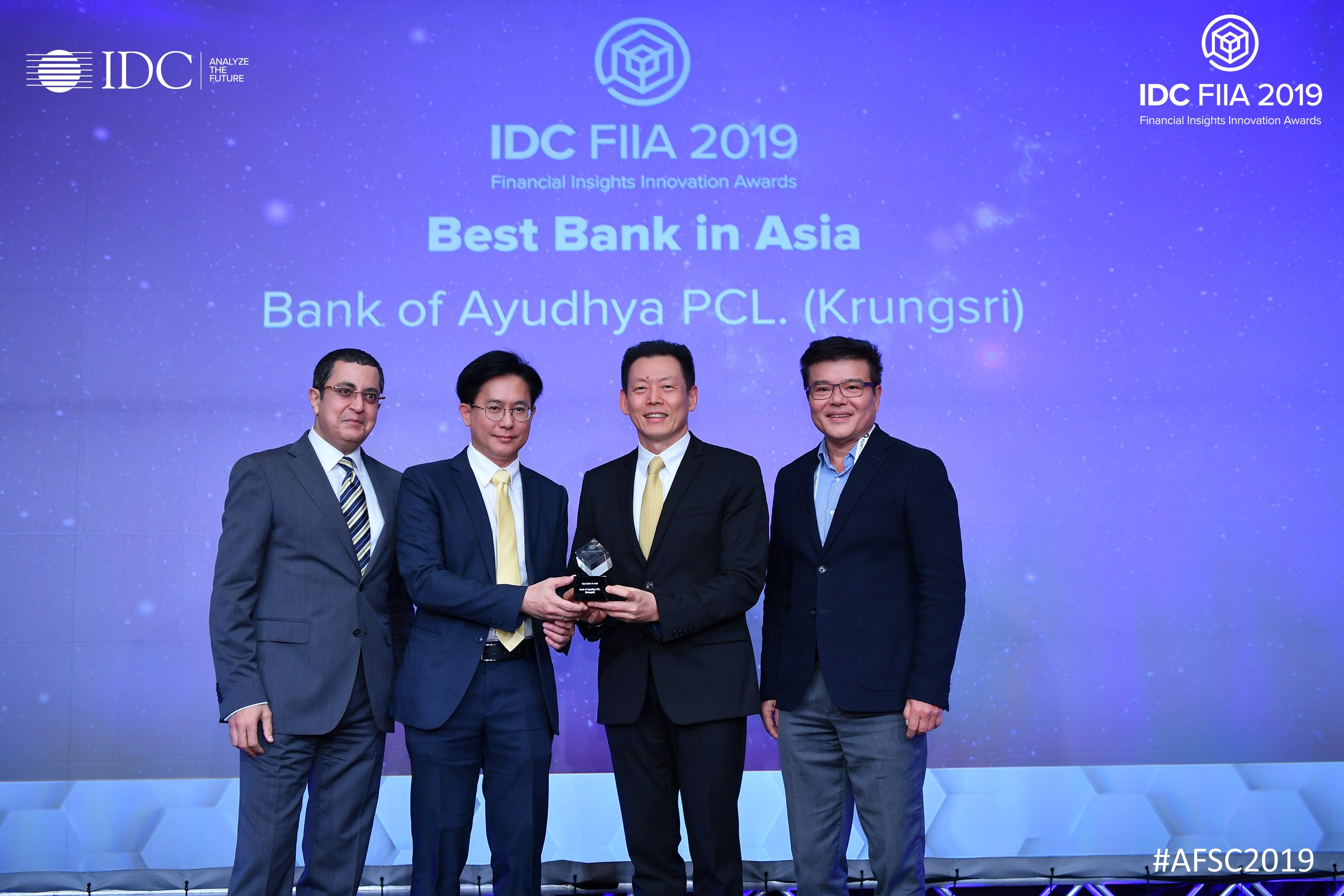 กรุงเทพฯ 7 มีนาคม 2562 : แดน ฮาร์โซโน่ (ที่ 2 จากขวา) ประธานกลุ่มธุรกิจลูกค้ารายย่อยและลูกค้าบุคคล และ ดร. สิเวศ โรจนสุนทร (ที่ 2 จากซ้าย) ผู้ช่วยกรรมการผู้จัดการใหญ่ สายงานบริหารระเบียบคำสั่งธนาคารและกระบวนการทางธุรกิจ ธนาคารกรุงศรีอยุธยา จำกัด (มหาชน) รับรางวัล Best Bank in Asia/ Pacific Financial Insights Innovation Awards (FIIA) จาก IDC Financial Insights บริษัทวิจัยด้านไอทีชั้นนำของโลก ในฐานะที่ธนาคารกรุงศรีอยุธยา และบริษัทในเครือประสบความสำเร็จอย่างยอดเยี่ยม ในการนำนวัตกรรมมาใช้บริหารจัดการกระบวนการปฏิบัติงานอย่างยั่งยืนทั่วทั้งองค์กร