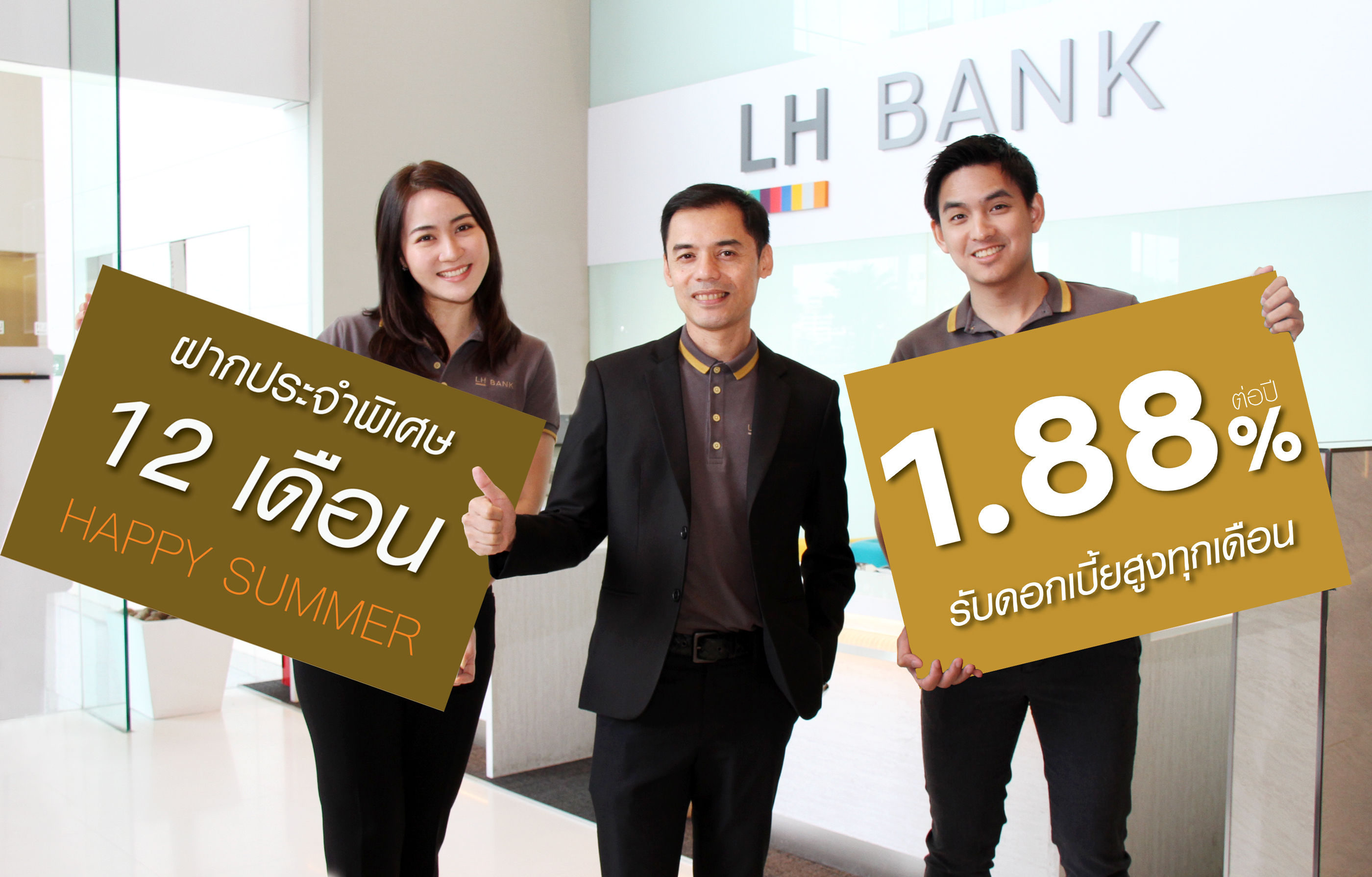 13 มีนาคม 2562 : นพคุณ ทอดสนิท ผู้ช่วยสายงานกิจการสาขา ธนาคารแลนด์ แอนด์ เฮ้าส์ จำกัด (มหาชน) (LH Bank) เปิดเผยว่า ธนาคารได้ออกผลิตภัณฑ์เงินฝากประจำพิเศษ 12 เดือน อัตราดอกเบี้ยสูงสุด 1.88% ต่อปี เพื่อตอบโจทย์ลูกค้าบุคคลและนิติบุคคลที่ไม่แสวงหากำไรที่กำลังมองหาเงินฝากที่ให้ผลตอบแทนสูง ยอดเงินฝากเริ่มต้นตั้งแต่ 2 ล้านบาทขึ้นไป รับดอกเบี้ยทุกเดือน