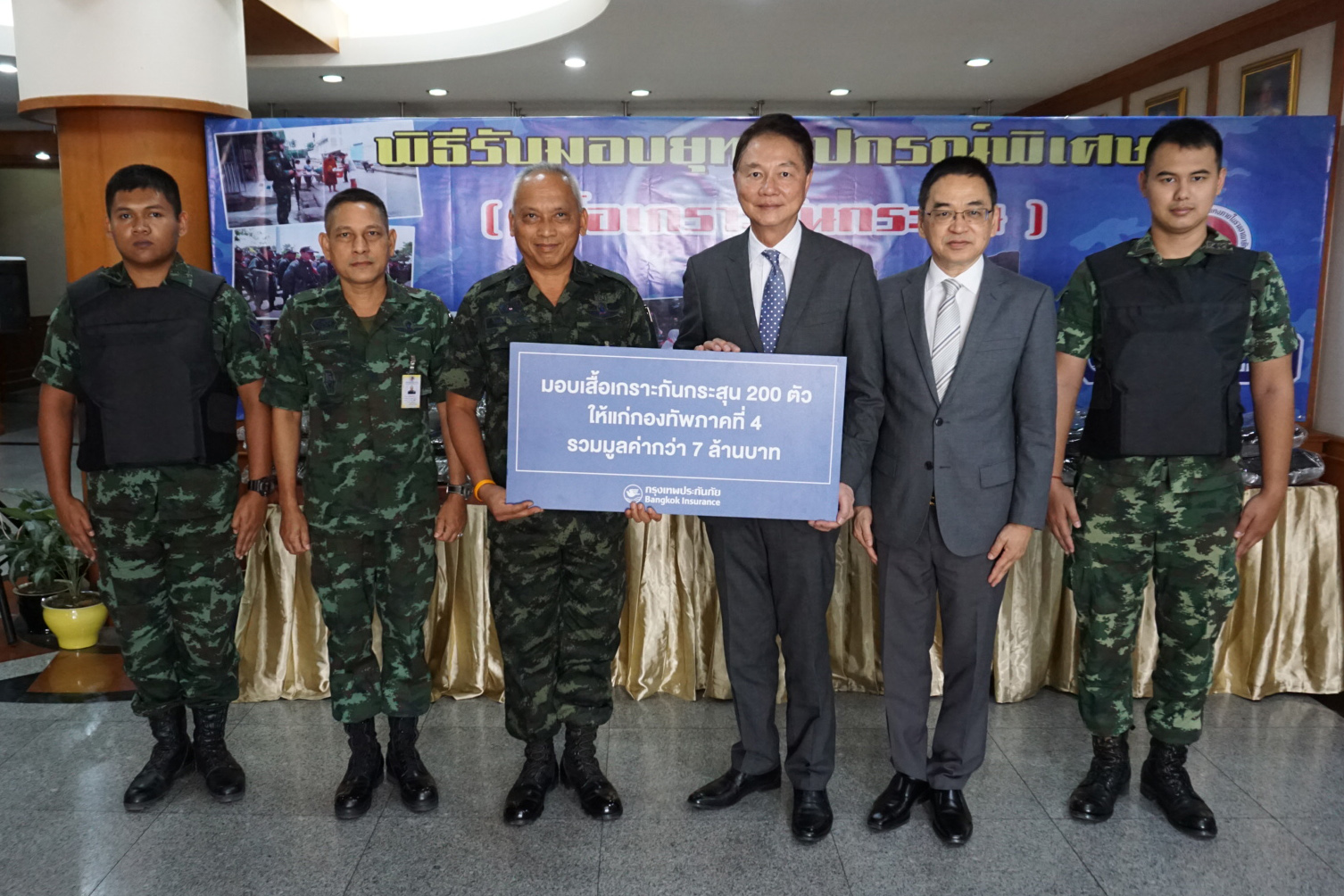 14 มีนาคม 2562 : บริษัท กรุงเทพประกันภัย จำกัด (มหาชน) หรือ BKI โดยอานนท์ วังวสุ (ที่ 3 จากขวา) ผู้ช่วยกรรมการผู้อำนวยการใหญ่ และนายสุชาติ จิรายุวัฒน์ (ที่ 2 จากขวา) ผู้อำนวยการ ธุรกิจสาขาและการร่วมทุน มอบเสื้อเกราะกันกระสุนยุทโธปกรณ์พิเศษ จำนวน 200 ตัว รวมมูลค่ากว่า 7 ล้านบาท ให้แก่กองอำนวยการรักษาความมั่นคงภายในภาค 4 ส่วนหน้า (กอ.รมน.ภาค 4 สน.)