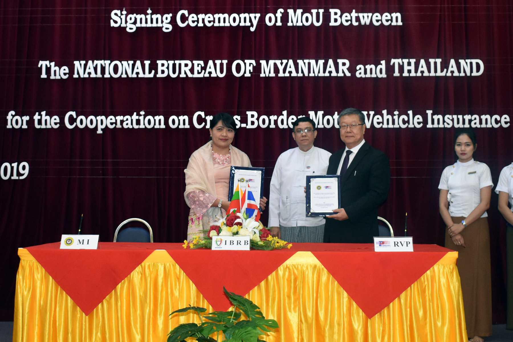 ซึ่งจัดให้มีการประกันภัยรถยนต์ภาคบังคับผ่านแดนระหว่างทั้งสองประเทศอย่างเป็นรูปธรรม และให้ความคุ้มครองแก่ประชาชน รวมทั้งรถขนส่งสินค้าผ่านแดนในด่านชายแดนสำคัญระหว่างประเทศไทยและสาธารณรัฐแห่งสหภาพเมียนมาร์ โดยมี Secretary of IBRB(Insurance Business Regulatory Board) ของเมียนมาร์และผู้แทนจากสำนักงานคณะกรรมการกำกับและส่งเสริมการประกอบธุรกิจประกันภัย (คปภ.) ให้เกียรติร่วมเป็นสักขีพยาน ณ บริษัท เมียนมา อินชัวรันซ์ สำนักงานใหญ่ เมืองย่างกุ้ง สาธารณรัฐแห่งสหภาพเมียนมาร์ เมื่อวันที่ 12 มีนาคม 2562 ที่ผ่านมา ![]()