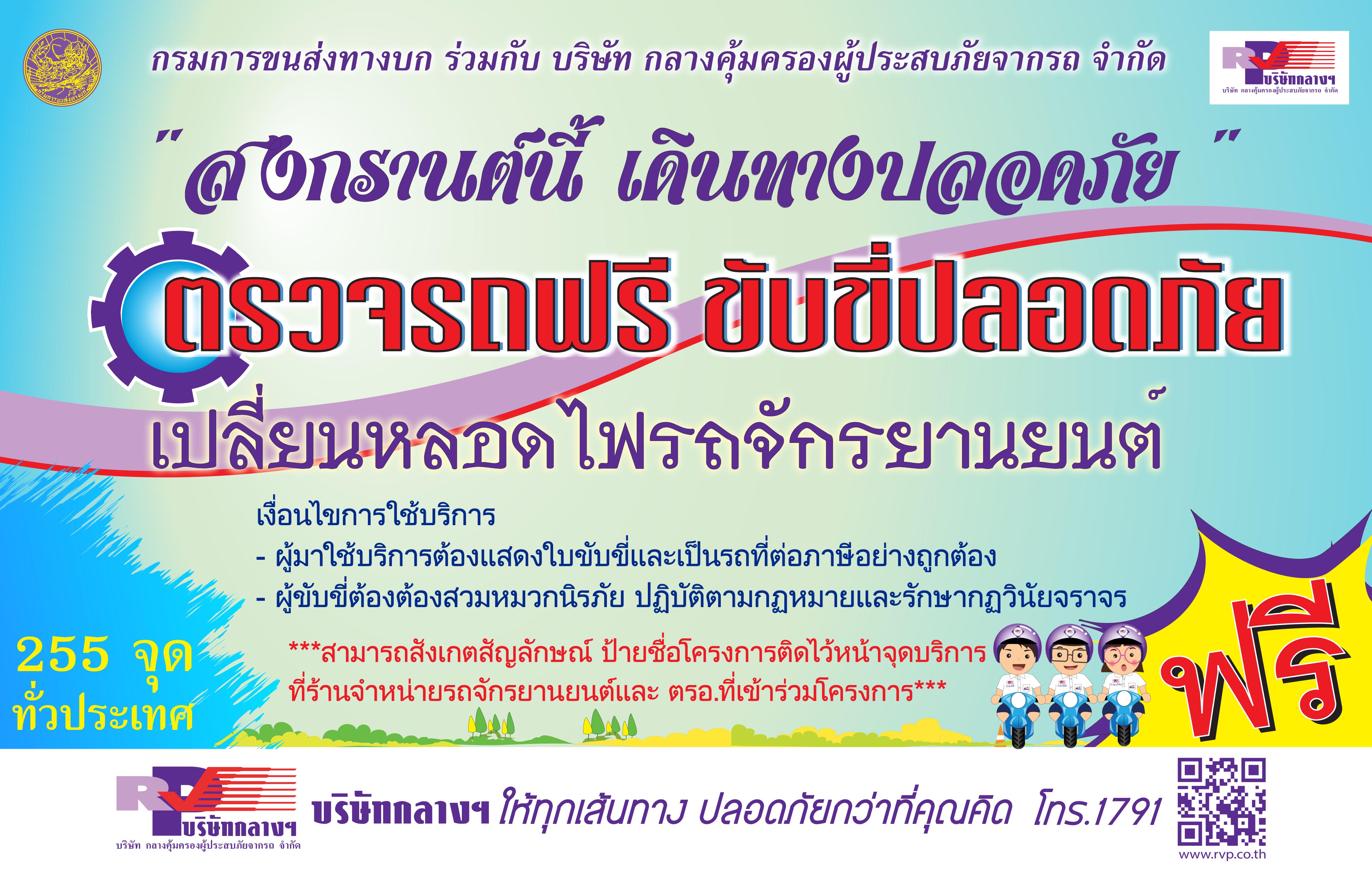 โดยมีการเปิดจุดให้บริการประชาชน ตรวจเช็คสภาพความพร้อมเบื้องต้นของรถจักรยานยนต์ จำนวน 255 จุดทั่วประเทศ อาทิ ให้บริการเปลี่ยนหลอดไฟฟรี ทั้งไฟท้าย ไฟหน้า ไฟเลี้ยว เพื่อให้ยานพาหนะปลอดภัย ให้บริการระหว่างวันที่ 15 มีนาคม ไปจนถึง 17 เมษายน 2562 โดยประชาชนผู้ใช้บริการสามารถสังเกตจุดให้บริการที่มีป้ายแบนเนอร์ชื่อและสัญลักษณ์โครงการติดไว้หน้าจุดบริการที่ร้านจำหน่ายรถจักรยานยนต์ และตรอ.ที่เข้าร่วมโครงการในทุกจังหวัดทั่วประเทศ โดยผู้มาใช้บริการจะต้องแสดงใบขับขี่ และเป็นรถที่ต่อภาษีอย่างถูกต้อง เพื่อส่งเสริมให้ผู้ใช้รถใช้ถนน ปฎิบัติตามกฎหมายและรักษากฏวินัยจราจร ต้องสวมหมวกนิรภัยทุกครั้งเพื่อความปลอดภัยในการเดินทาง