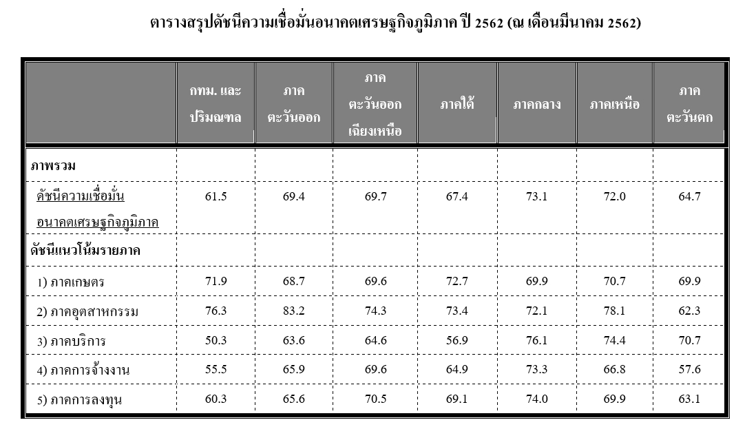 โดยความร่วมมือของสำนักงานคลังจังหวัด 76 จังหวัดทั่วประเทศ สภาอุตสาหกรรมแห่งประเทศไทย และสภาหอการค้าแห่งประเทศไทย พบว่า ดัชนีความเชื่อมั่นอนาคตเศรษฐกิจ (คาดการณ์ 6 เดือนข้างหน้า) อยู่ในเกณฑ์ที่ดีทุกภูมิภาค นำโดยภาคกลาง ภาคเหนือ และภาคตะวันออก โดยได้รับปัจจัยสนับสนุนหลักจากภาคอุตสาหกรรมและการเกษตร เป็นสำคัญ” ดัชนีความเชื่อมั่นอนาคตเศรษฐกิจภาคกลาง ทิศทางการขยายตัวดีอยู่ที่ระดับ 73.1