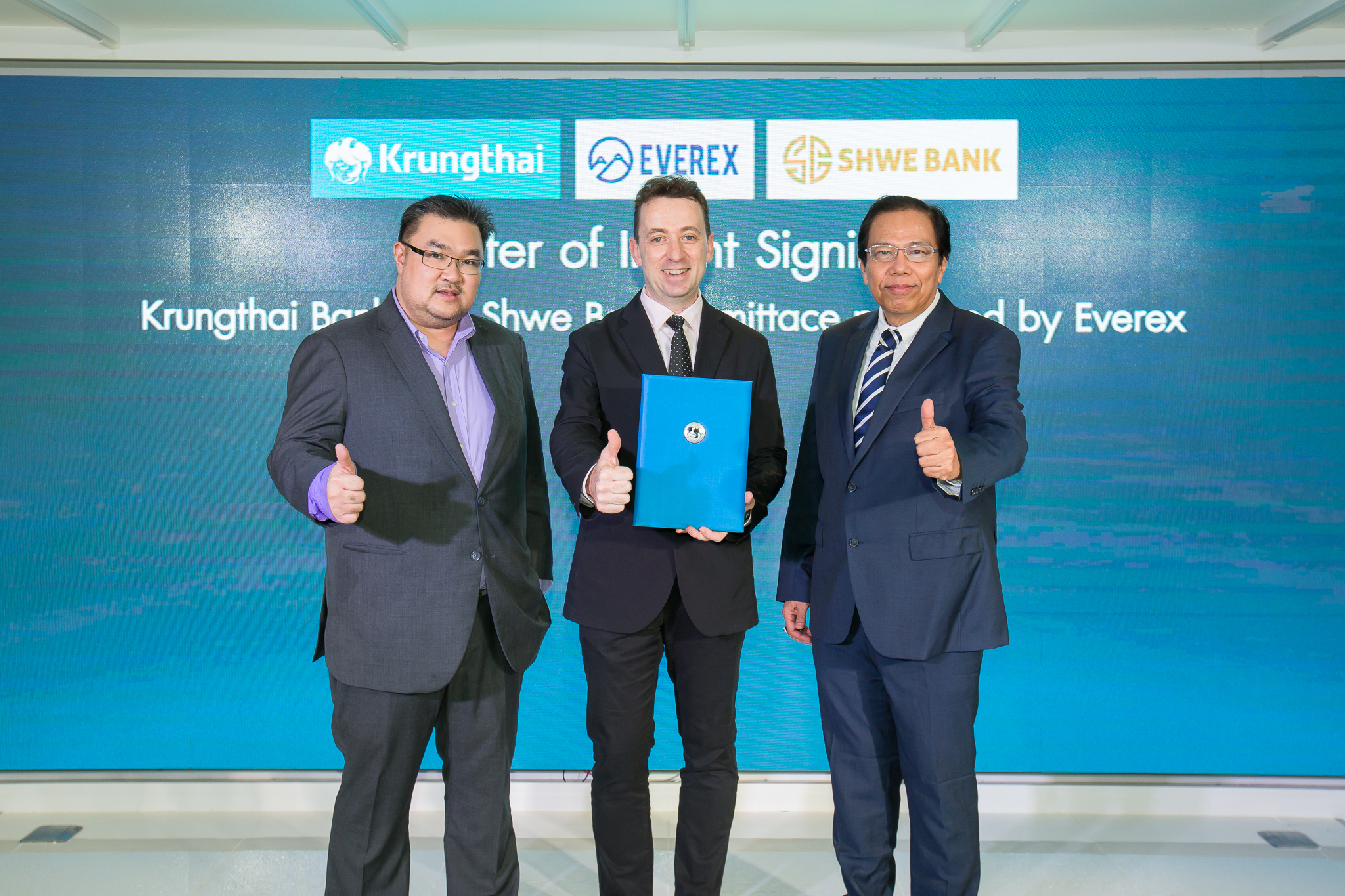 1 เมษายน 2562 : นายรวินทร์ บุญญานุสาสน์ รองกรรมการผู้จัดการใหญ่ สายงานธุรกิจตลาดเงินตลาดทุน ธนาคารกรุงไทย นาย Alex Lane ประธานกรรมการบริหาร กลุ่มบริษัท Everex และ นาย Thein Zaw, Executive Vice Chairman, Shwe Rural & Urban Development Bank ร่วมลงนามใน Letter of Intent การร่วมมือนำเสนอบริการเงินโอนข้ามประเทศจากไทยไปสาธารณรัฐแห่งสหภาพเมียนมา ด้วยบริการ Krungthai Bank and Shwe Bank Remittance powered by Everex เพื่ออำนวยความสะดวกในการโอนเงินต่างประเทศให้กับแรงงานเมียนมาที่อยู่ในประเทศไทย