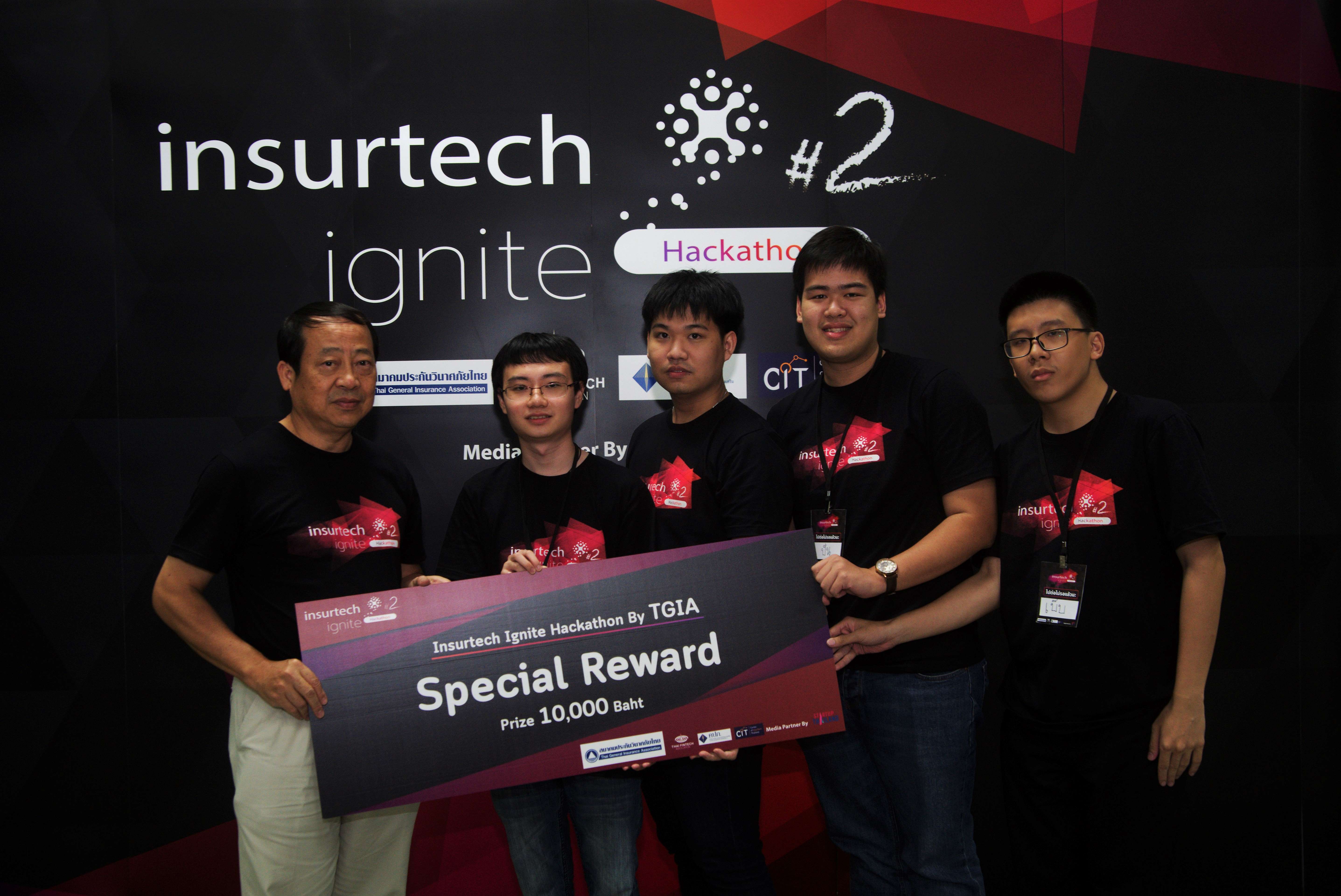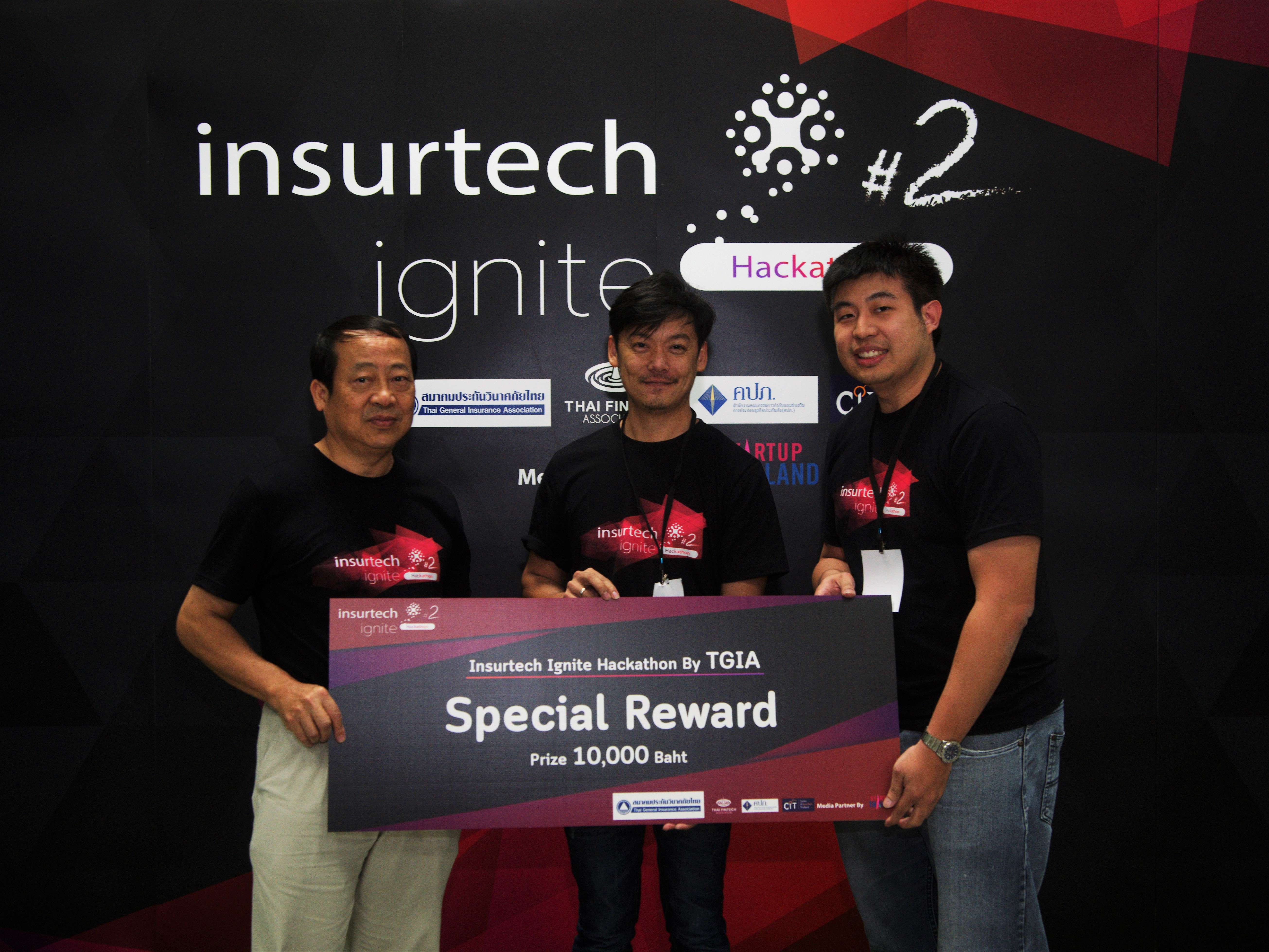 สำหรับการแข่งขัน “Insurtech Ignite Hackathon # 2” ในรอบ Hackathon นี้ ทีมชนะเลิศ จะได้รับเงินรางวัล 80,000 บาท จากสำนักงานคณะกรรมการกำกับและส่งเสริมการประกอบธุรกิจประกันภัย (คปภ.) รางวัลจากสมาคมประกันวินาศภัยไทย ทีมรองชนะเลิศอันดับหนึ่ง ได้รับเงินรางวัล 50,000 บาท ทีมรองชนะเลิศอันดับสอง ได้รับเงินรางวัล 30,000 บาท และรางวัลพิเศษ จำนวน 2 รางวัล ๆ ละ 10,000 บาท โดยมีผลการแข่งขัน ดังนี้