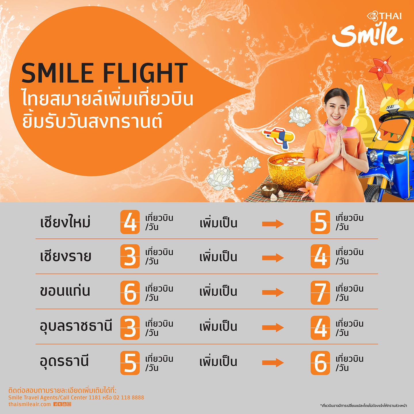 · เส้นทางอุดรธานี 5 เที่ยวบิน เป็น 6 เที่ยวบิน ต่อวัน โดยผู้สนใจสามารถสำรองบัตรโดยสารได้ที่ www.thaismileair.com, Call Center 1181หรือ 02-118-8888, ห้องจำหน่ายบัตรโดยสารไทยสมายล์ (Smile Service Center) และตัวแทนจำหน่ายบัตรโดยสารไทยสมายล์ทั่วประเทศ (Smile Travel Agents) ![]()