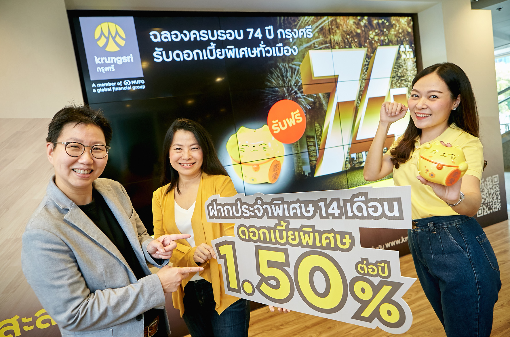 พร้อมรับดอกเบี้ย รายเดือน เริ่มขั้นต่ำเพียง 5,000 บาท ในโอกาสที่ธนาคารกรุงศรีฉลองครบรอบ 74 ปี พิเศษรับฟรี! แมวกวัก สีเหลืองสัญลักษณ์แห่งความรัก เมื่อเปิดบัญชีตั้งแต่ 10,000 บาท ตั้งแต่วันนี้ถึง 17 พ.ค. 62 สนใจติดต่อกรุงศรี ทุกสาขาทั่วประเทศ หรือสอบถามข้อมูลเพิ่มเติมได้ที่ Call 1572 ![]()