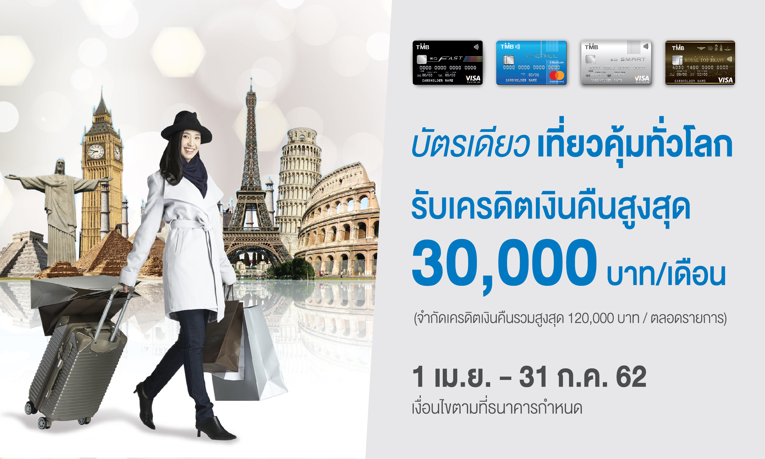 10 เมษายน 2562 : บัตรเครดิตทีเอ็มบี บัตรเดียว เที่ยวคุ้มทั่วโลก ให้คุณคุ้มสุดเมื่อนำไปใช้จ่ายต่างประเทศ รับเครดิตเงินคืนสูงสุด 30,000 บาท/เดือน (รวมสูงสุด 120,000 บาท/ตลอดรายการ) เมื่อมียอดใช้จ่ายสะสมในต่างประเทศ เมื่อชำระเป็นสกุลเงินต่างประเทศ (ไม่รวมยอดช้อปผ่านทางออนไลน์) ยอดสะสมครบ10,000 บาท ขึ้นไป/เดือน รับเครดิตเงินคืน 150 บาท ยอดสะสมครบ 40,000 บาท ขึ้นไป/เดือน รับเครดิตเงินคืน 850 บาท ยอดสะสมครบ80,000 บาท ขึ้นไป/เดือน รับเครดิตเงินคืน 1,800 บาท ยอดสะสมครบ 1,200,000 บาท ขึ้นไป/เดือน รับเครดิตเงินคืน 30,000 บาท จำกัดรวมสูงสุด 4 สิทธิ์/ตลอดรายการ จำกัด 1 สิทธิ์ /บัตร /เดือน