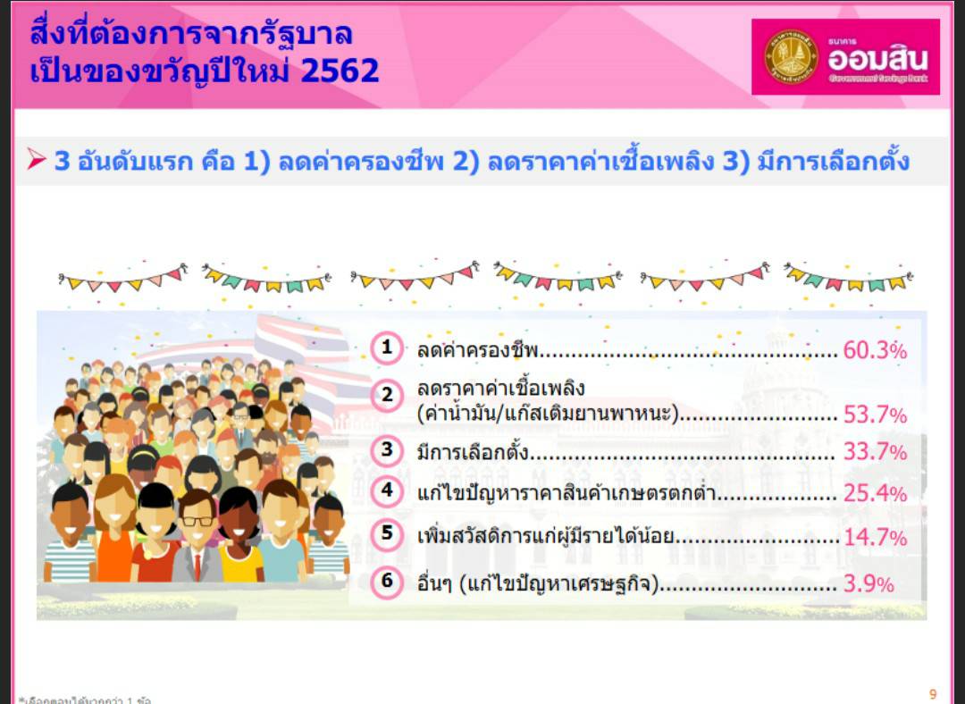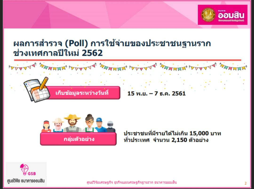 11 เมษายน 2562 : ดร.ชาติชาย พยุหนาวีชัย ผู้อำนวยการธนาคารออมสิน เปิดเผยว่า “ศูนย์วิจัยฯ ได้ทำการสำรวจการใช้จ่ายของประชาชนฐานรากในช่วงเทศกาลสงกรานต์ จากกลุ่มตัวอย่างประชาชนที่มีรายได้ไม่เกิน 15,000 บาททั่วประเทศจำนวน 2,186 ตัวอย่าง พบว่า ภาพรวมการใช้จ่ายของประชาชนฐานรากในช่วงเทศกาลสงกรานต์ คาดว่าจะมีการจับจ่ายใช้สอยประมาณ 16,130 ล้านบาท ค่าใช้จ่ายเฉลี่ยต่อคนอยู่ที่ 3,670 บาท