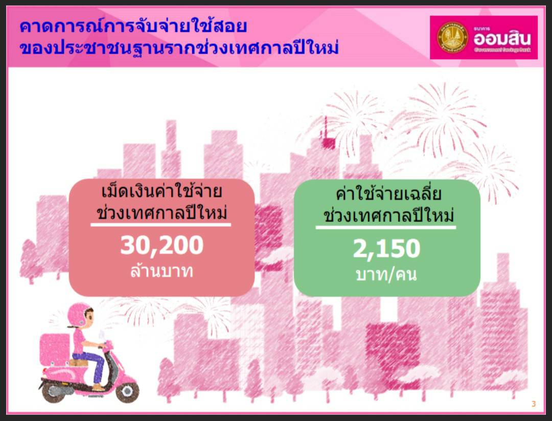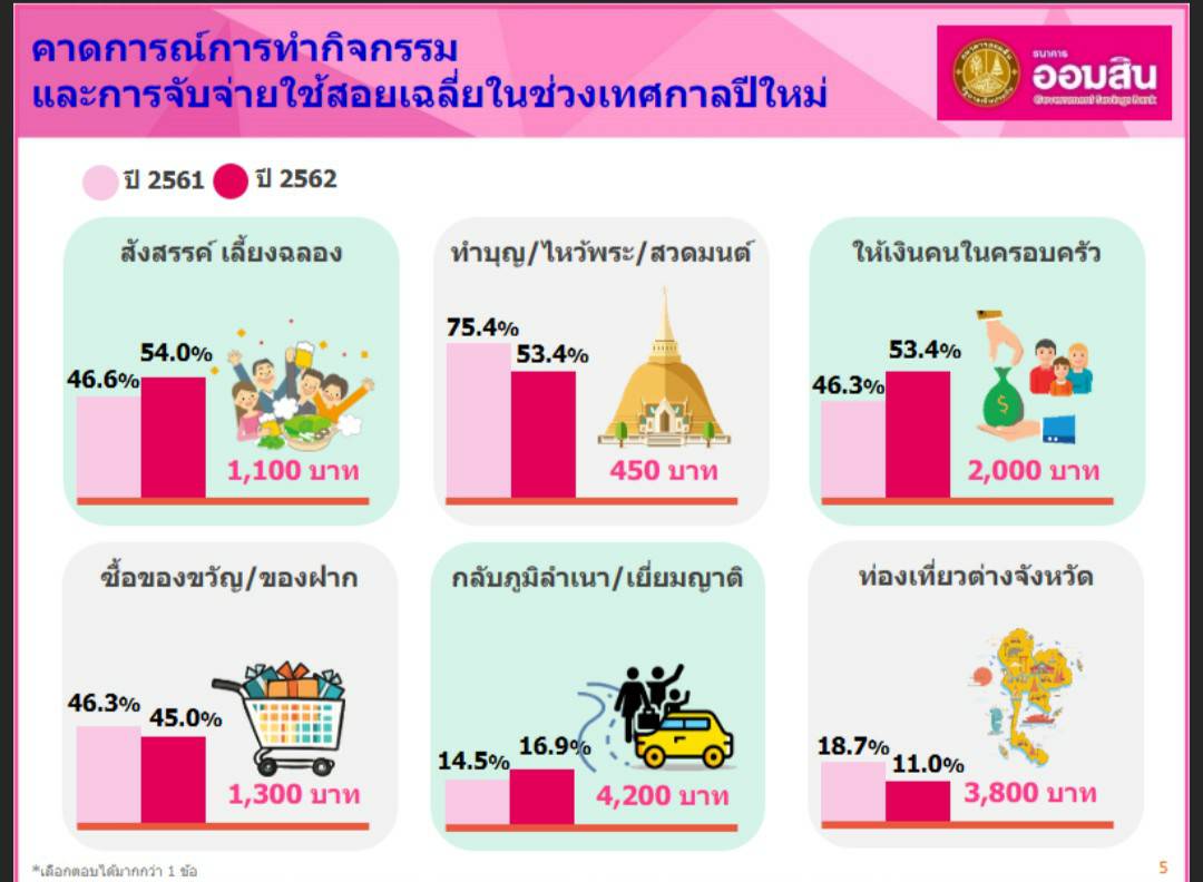 ทั้งนี้ ในภาพรวมประชาชนฐานรากมีการทำกิจกรรมและการใช้จ่ายใกล้เคียงกับปีก่อน โดยมีค่าใช้จ่ายในแต่ละกิจกรรมสูงขึ้นเล็กน้อย ยกเว้นการซื้อของให้ตนเอง/ผู้อื่น และการท่องเที่ยวต่างจังหวัดที่มีค่าใช้จ่ายเฉลี่ยแต่ละกิจกรรมลดลง ทั้งนี้ พบว่ามีการทำกิจกรรมสังสรรค์ เลี้ยงฉลอง และเดินทางกลับภูมิลำเนา/เยี่ยมญาติเพิ่มขึ้นจากปีก่อน โดยกลุ่มตัวอย่างส่วนใหญ่ที่เดินทางกลับภูมิลำเนาจะเป็นผู้ที่อาศัยอยู่ในกรุงเทพฯและปริมณฑล มีการวางแผนการเดินทางไปพื้นที่ภาคตะวันออกเฉียงเหนือ