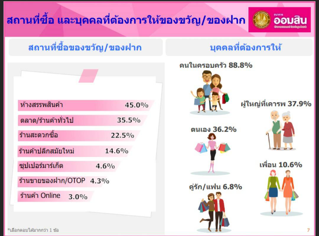 ส่วนของขวัญ/ของฝากที่คาดว่าจะซื้อในช่วงเทศกาลสงกรานต์ พบว่า กลุ่มตัวอย่าง ร้อยละ 45.9 มีแผนที่จะซื้อของโดย 3 อันดับแรก คือ อาหาร/ขนม (ร้อยละ 66.9) เสื้อผ้า/เครื่องนุ่งห่ม (ร้อยละ 51.8) และผัก/ผลไม้ (ร้อยละ 50.5) ส่วนบุคคล ที่ต้องการให้ของขวัญ/ของฝากมากที่สุดคือ คนในครอบครัว (ร้อยละ 87.1) รองลงมา คือ ผู้ใหญ่ที่เคารพ (ร้อยละ 37.9) และตนเอง (ร้อยละ 35.2) ตามลำดับ