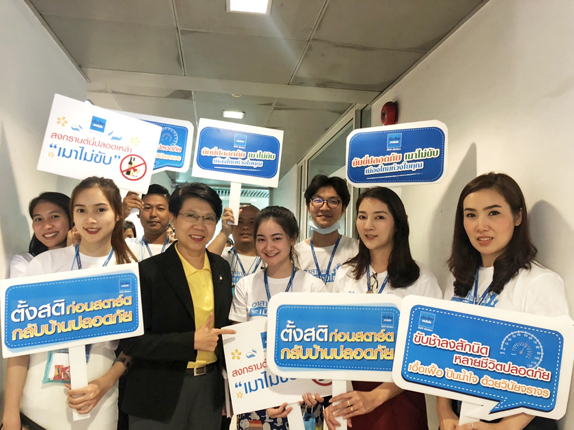 12 เมษายน 2562 : นวลพรรณ ล่ำซำ กรรมการผู้จัดการ และประธานเจ้าหน้าที่บริหาร พร้อมผู้บริหารและกลุ่มพนักงานอาสา บริษัท เมืองไทยประกันภัย จำกัด (มหาชน) จัดกิจกรรมรณรงค์ความปลอดภัยในช่วงเทศกาลสงกรานต์ ด้วยการเดินประชาสัมพันธ์รณรงค์การขับขี่ปลอดภัย พร้อมแจกซองกันน้ำซึ่งบรรจุเบอร์โทรสายด่วนแจ้งเหตุฉุกเฉิน พร้อมอุปกรณ์กันง่วงระหว่างเดินทาง อาทิ ลูกอม ยาดม ณ บริเวณตลาดเมืองไทย ถนนรัชดาภิเษก และภายในสำนักงานใหญ่ของบริษัทฯ