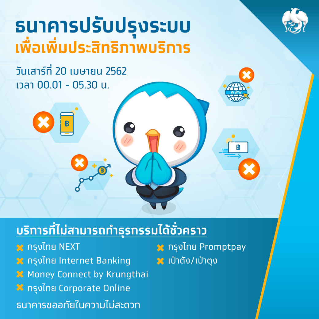 18 เมษายน 2562 : ธนาคารกรุงไทย จะดำเนินการพัฒนาและเพิ่มประสิทธิภาพของระบบงานอิเล็กทรอนิกส์ ส่งผลให้ลูกค้าไม่สามารถใช้บริการบางประเภทชั่วคราว ในวันเสาร์ที่ 20 เมษายน 2562 ระหว่างเวลา 00.01 – 05.30 น. ได้แก่ กรุงไทย NEXT กรุงไทย Promptpay แอปพลิเคชั่นเป๋าตัง เป๋าตุง Money Connect by Krungthai (บริการจองซื้อหลักทรัพย์ออนไลน์ ) กรุงไทย Internet Banking และ กรุงไทย Corporate Online สำหรับบริการอื่นๆ ใช้บริการได้ตามปกติ ธนาคารขออภัยในความไม่สะดวก สอบถามข้อมูลเพิ่มเติมได้ที่ Krungthai Call Center หมายเลข 02 111 1111 ![]()