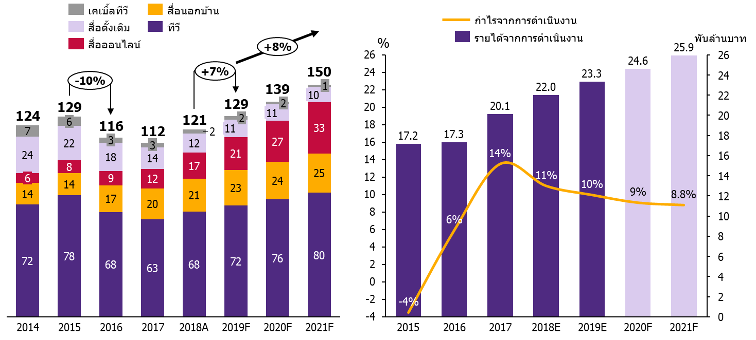 อย่างไรก็ตาม ภาพรวมตลาดทีวีดิจิทัลในช่วง 5 ปีที่ผ่านมายังอยู่ในสภาวะไม่ดีนัก สะท้อนได้จากรายได้รวมมีการหดตัวลงจาก 1.24 แสนล้านบาท ในปี 2014 มาอยู่ที่ 1.19 แสนล้านบาท ในปี 2018 (-6%CAGR) โดยมีสาเหตุจากเศรษฐกิจที่ ผันผวนและการชะลอตัวของกำลังซื้อ ประกอบกับพฤติกรรมผู้บริโภคที่เปลี่ยนไปจากการมีช่องโทรทัศน์ทางเลือกและสื่อออนไลน์ที่เข้ามามีบทบาทในชีวิตมากขึ้น ทำให้บริษัทและเจ้าของผลิตภัณฑ์ต่าง ๆ ปรับลดงบโฆษณาในช่องทางทีวีลงตามไปด้วย