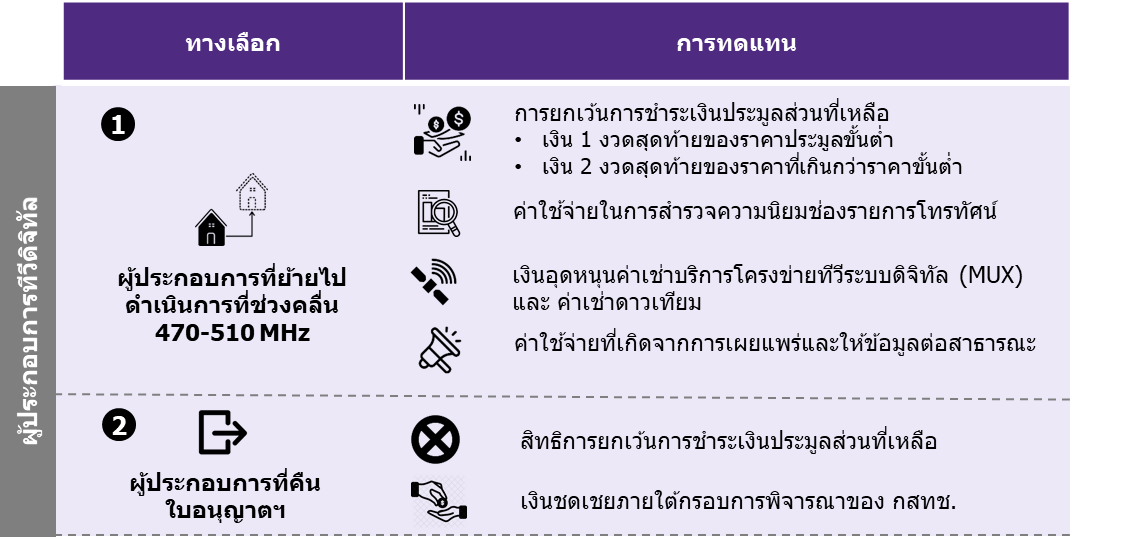 โดย กสทช. ได้ยื่นข้อเสนอให้กับผู้ประกอบการทีวีดิจิทัล 2 ทางเลือก ได้แก่ 1) ผู้ประกอบการย้ายไปดำเนินการที่ช่วงคลื่น 470-510MHz และจะได้รับการยกเว้นค่าธรรมเนียมใบอนุญาตงวดสุดท้ายของราคาประมูลขั้นต่ำและ 2 งวดสุดท้ายของราคาที่เกินกว่าราคาขั้นต่ำ ค่าใช้จ่ายในการเช่าบริการโครงข่ายทีวีระบบดิจิทัล (MUX) ตลอดระยะเวลาใบอนุญาตที่เหลืออยู่ ค่าใช้จ่ายในการสำรวจความนิยมช่องรายการโทรทัศน์ และค่าใช้จ่ายอื่น ๆ ที่เกิดจากการเรียกคืนคลื่นความถี่