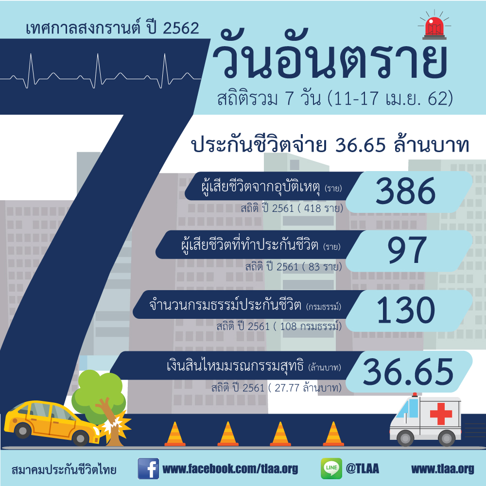 ทั้งนี้ ศูนย์อำนวยการป้องกันและลดอุบัติเหตุทางถนนช่วงเทศกาลสงกรานต์ พ.ศ. 2562 (ศปถ.) ได้รายงานว่าช่วง 7 วันอันตราย ระหว่างวันที่ 11 ถึง 17 เมษายน 2562 ที่ผ่านมามีอุบัติเหตุเกิดขึ้น 3,338 ครั้ง มีผู้บาดเจ็บ 3,442 ราย และมีผู้เสียชีวิตทั้งสิ้น 386 ราย