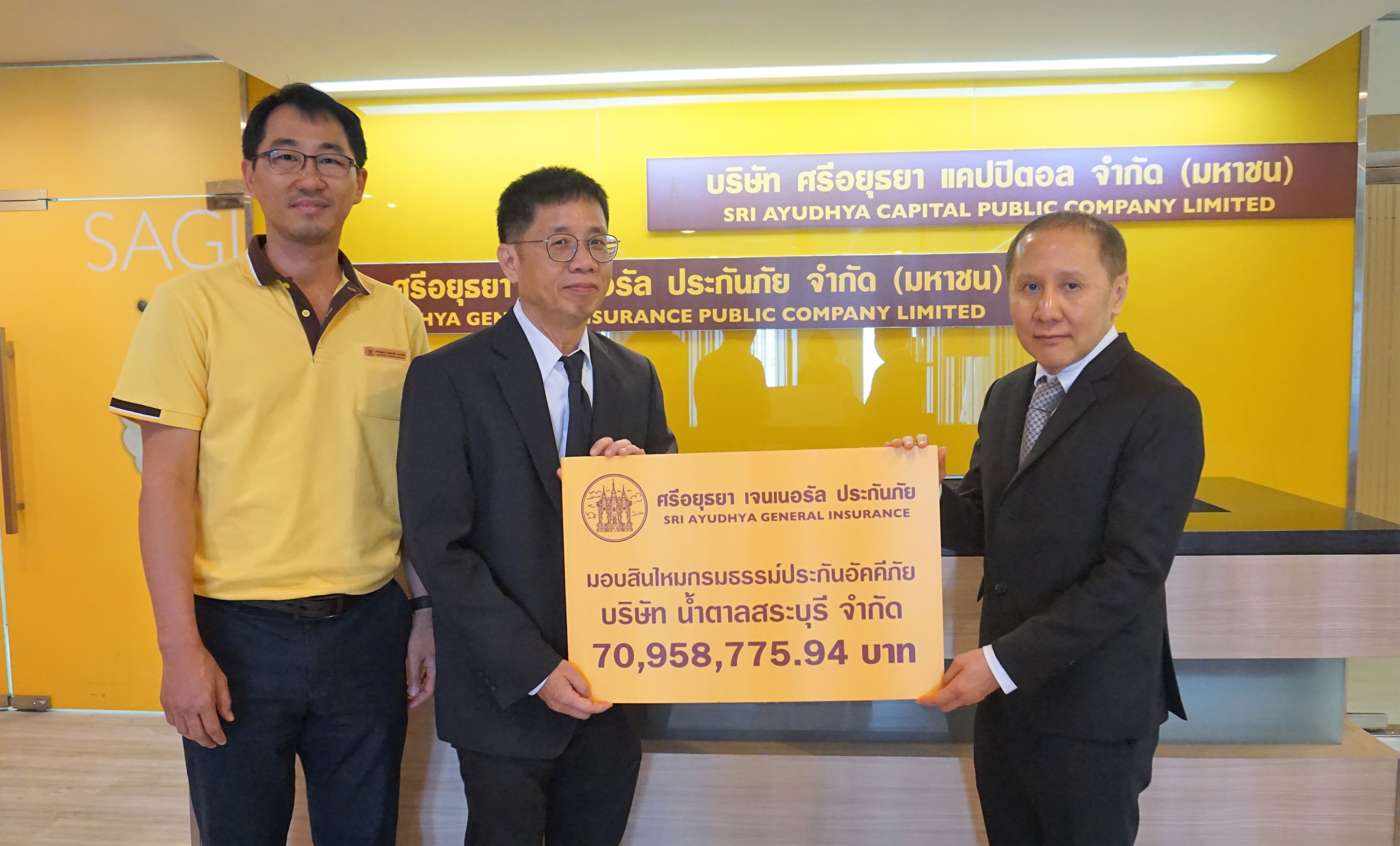 23 เมษายน 2562 : ทิวากร กาญจนกิจ ผู้ช่วยกรรมการผู้อำนวยการ บริษัท ศรีอยุธยา เจนเนอรัล ประกันภัย จำกัด (มหาชน) มอบเงินสินไหมทดแทนตามกรมธรรม์ประกันอัคคีภัย จำนวน 70,958,775.94 บาท แก่ พิศิษฐ์ เกียรติวัฒนาพูน ผู้จัดการอาคาร บริษัท น้ำตาลสระบุรี จำกัด เนื่องจากเกิดเหตุเพลิงไหม้สต๊อกสินค้าได้รับความเสียหาย ณ อาคารสำนักงานใหญ่ ถนนเพลินจิต ![]()