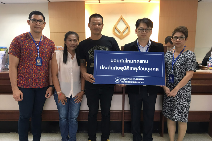 23 เมษายน 2562 : บริษัท กรุงเทพประกันภัย จำกัด (มหาชน) หรือ BKI โดย ชัยรัตน์ จงธรรมจินดา (ที่ 2 จากขวา) ผู้จัดการสาขาชุมพร ธุรกิจสาขาและการร่วมทุน เป็นผู้แทนบริษัทฯ มอบสินไหมทดแทนประกันภัยอุบัติเหตุส่วนบุคคล จำนวน 420,000 บาท (สี่แสนสองหมื่นบาทถ้วน) ให้แก่ ดนัย ตรีทอง (ที่ 3 จากซ้าย)