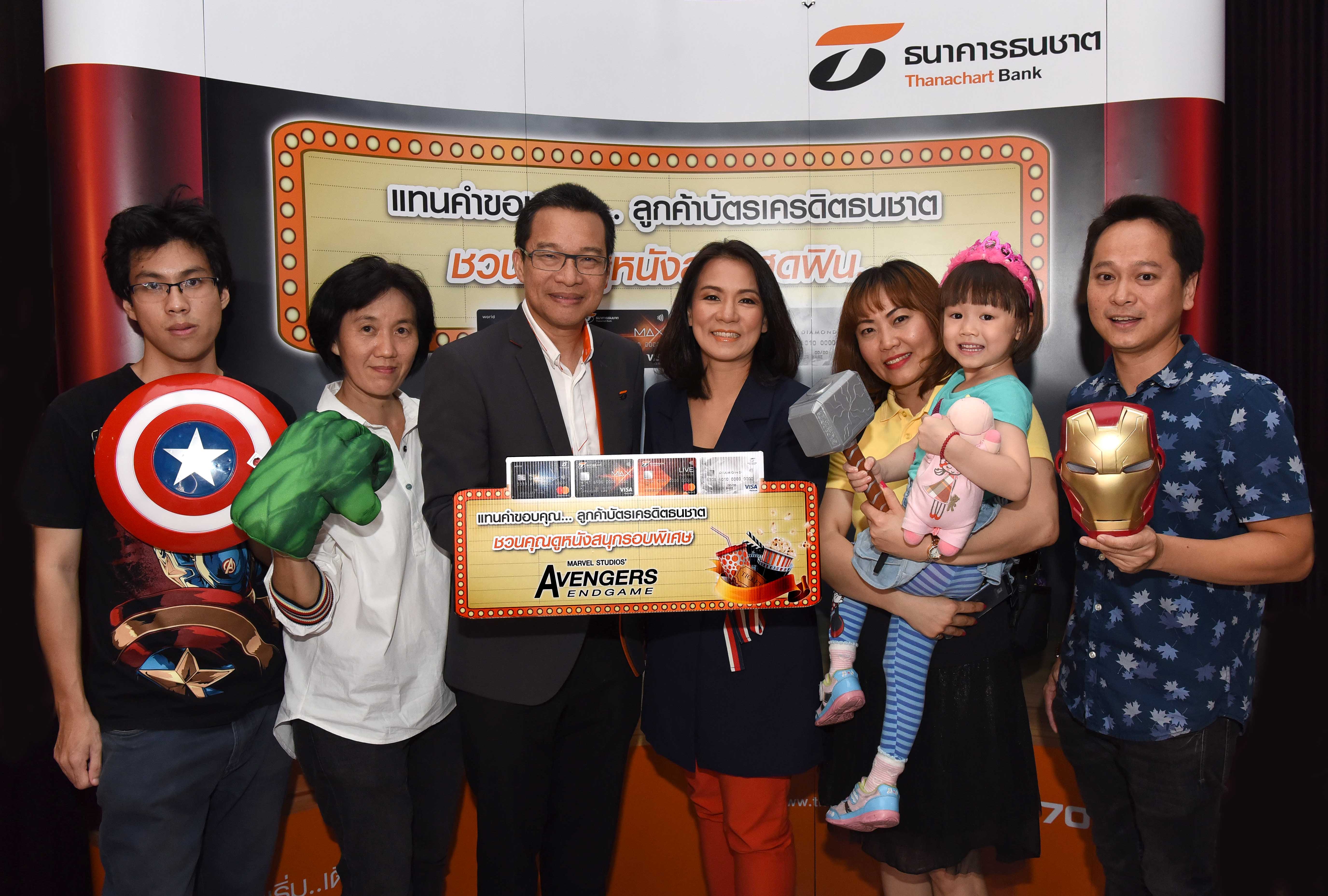 29 เมษายน 2562 : ธนาคารธนชาต จำกัด (มหาชน) นำโดย วิจักษณ์ ประดิษฐวณิช (ที่ 3 จากซ้าย) ผู้ช่วยกรรมการผู้จัดการ ธุรกิจสินเชื่อไม่มีหลักประกัน และ ธีรนารถ พ่วงมหา (ที่ 4 จากซ้าย) ผู้อำนวยการอาวุโส พัฒนาผลิตภัณฑ์สินเชื่อไม่มีหลักประกัน มอบความสุขช่วงซัมเมอร์ ขอบคุณลูกค้า บัตรเครดิตธนชาต BLUE Diamond, MAX, LIVE และ DIAMOND ที่มีประวัติการชำระดีและใช้จ่ายต่อเนื่อง ปิดโรงภาพยนตร์ 1,000 กว่าที่นั่งให้ลูกค้าชมหนังฟอร์มยักษ์แห่งปีในกิจกรรม “บัตรเครดิต ธนชาต ชวนลูกค้าดูหนังฟอร์มยักษ์ Avengers : End game” พร้อมชิลกับ Combo set ป๊อปคอร์นและน้ำดื่ม รวมทั้งสนุกสนานกับกิจกรรมถ่ายภาพ Snap Print และรับของที่ระลึก ณ สยามภวาลัย รอยัล แกรนด์เธียเตอร์ สยามพารากอน ![]()