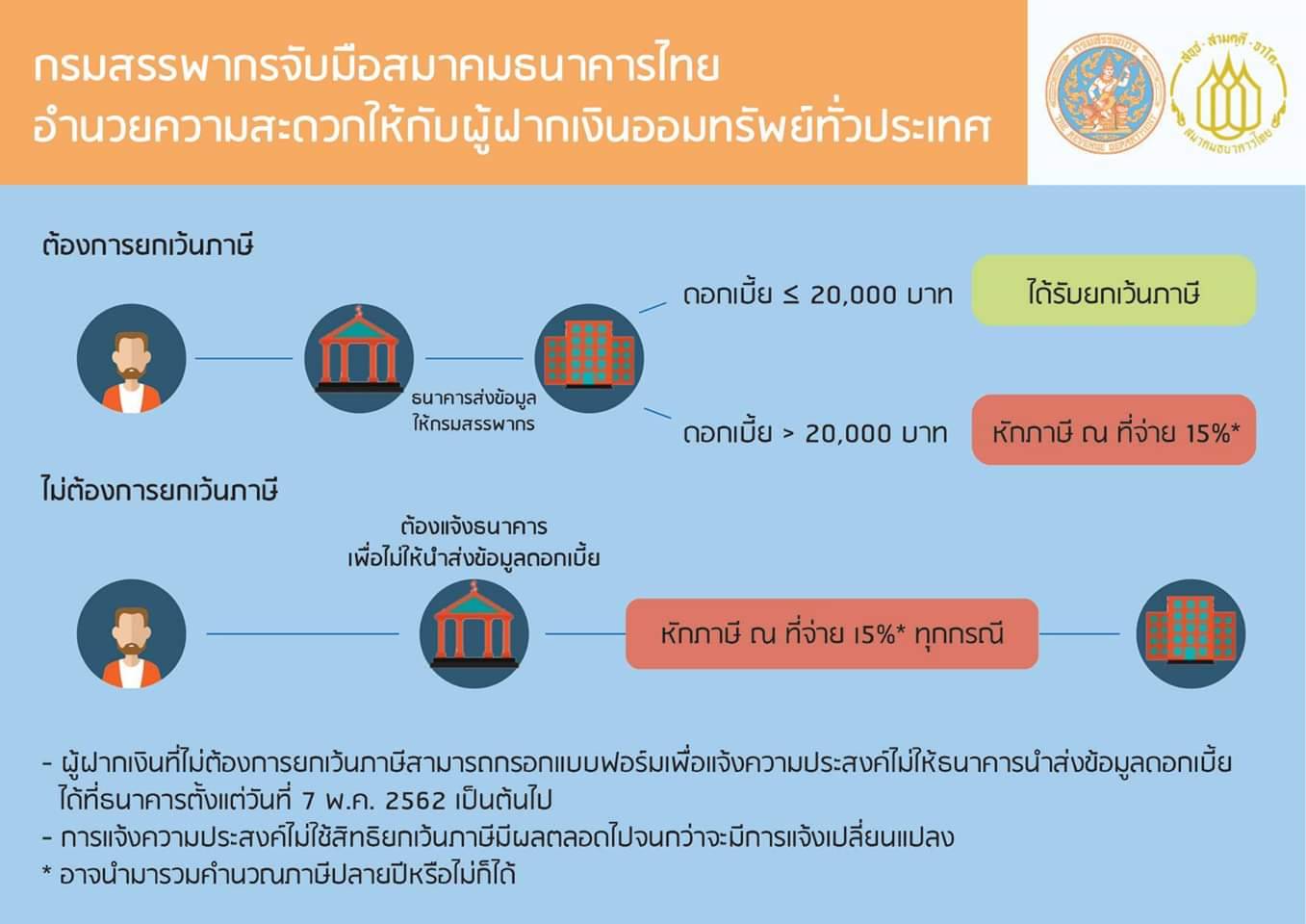 โดยการแจ้งครั้งเดียวจะมีผลตลอดไป จนกว่าลูกค้าจะมาแจ้งเปลี่ยนแปลงเป็นอื่น ทั้งนี้ ลูกค้าที่มาแจ้งภายในวันที่ 14 พฤษภาคม 2562 จะมีผลตั้งแต่รอบภาษีดอกเบี้ยจ่ายครึ่งปีแรกในเดือนมิถุนายนเป็นต้นไป สอบถามข้อมูลเพิ่มเติมที่ศูนย์สารนิเทศสรรพากร (RD Intelligence Center) โทร. 1161 หรือที่สำนักงานสรรพากรทุกแห่งทั่วประเทศ