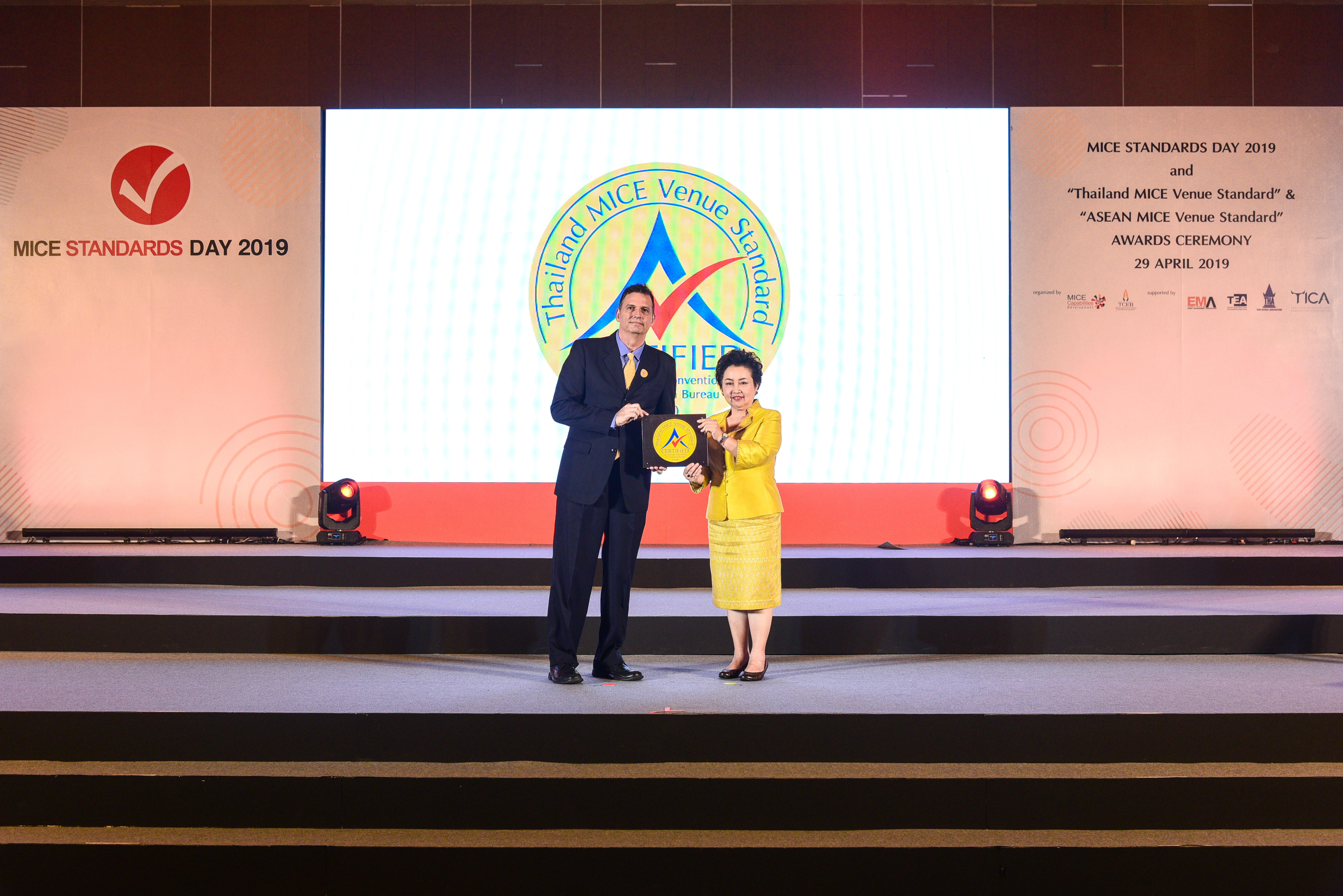 กรุงเทพฯ 7 พฤษภาคม 2562 : มิสเตอร์ เจมส์ เอนเกล (James R. Engel) Chief Learning Architect เอสอีเอซี (SEAC) ศูนย์พัฒนาและส่งเสริมการเรียนรู้ตลอดชีวิตแห่งภูมิภาคอาเซียน เข้ารับตราสัญลักษณ์มาตรฐานสถานที่จัดงาน ประเทศไทยและสถานที่จัดงานอาเซียน (Thailand and ASEAN MICE Venue Standard) ประจำปี 2562 ประเภทห้องประชุม จัดขึ้นโดยสำนักงานส่งเสริมการจัดการประชุมและนิทรรศการ (องค์การมหาชน) หรือ สสปน. เพื่อรับรองมาตรฐานสถานที่ในการจัดประชุมสัมมนาให้แก่ผู้ประกอบการอุตสาหกรรมไมซ์ทั่วประเทศ โดยครั้งนี้ได้รับเกียรติจาก ดร.อรรชกา สีบุญเรือง (ขวา) ประธานกรรมการ สำนักงานส่งเสริมการจัดการประชุมและนิทรรศการ มอบตราสัญลักษณ์ ณ เดอะ เบอร์เคลีย์ โฮเต็ล ประตูน้ำ เมื่อเร็วๆ นี้ ![]()