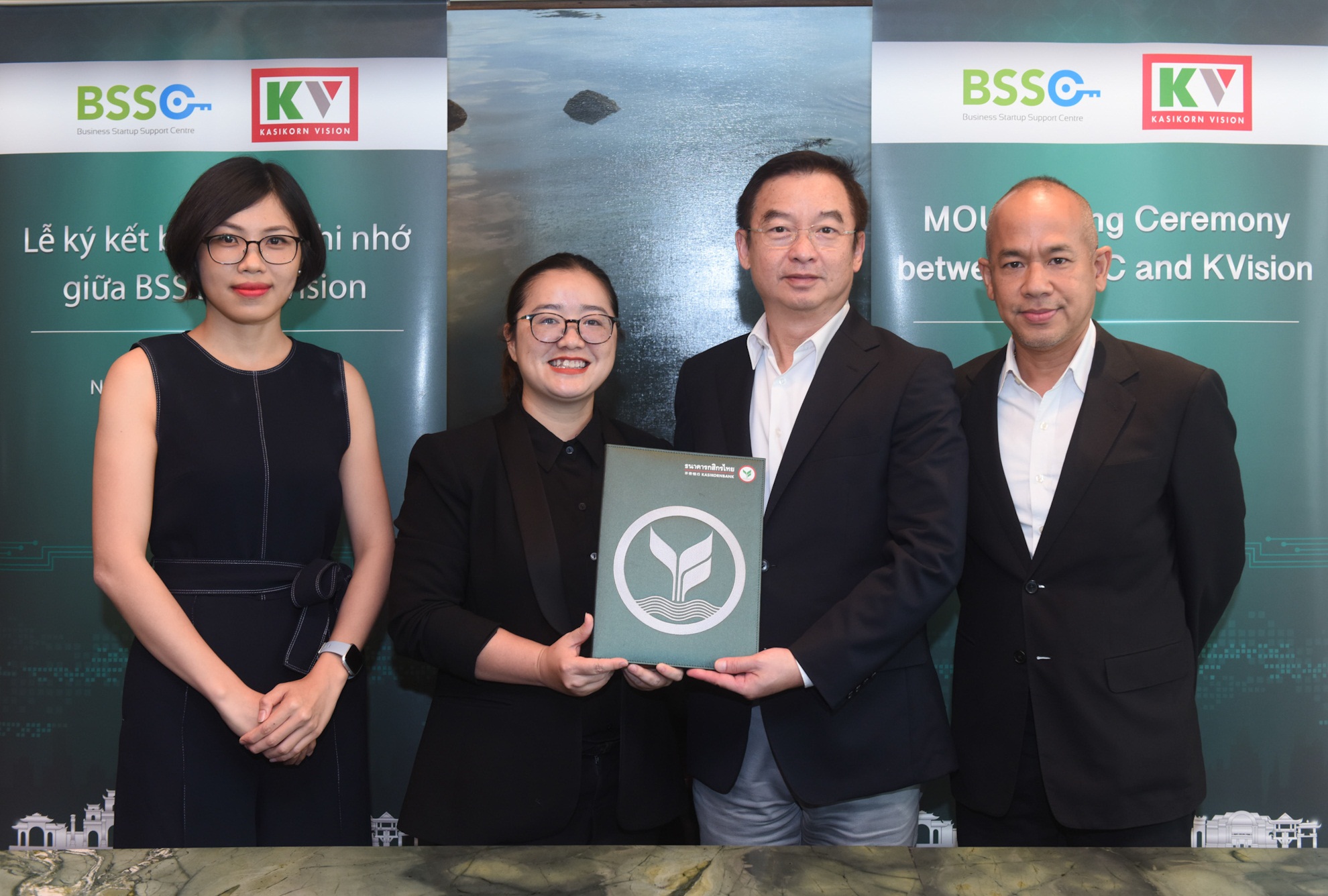 7 พฤษภาคม 2562 : พัฒนพงศ์ ตัณฑ์สมบูรณ์ (ที่ 2 จากขวา) กรรมการผู้จัดการ บริษัท กสิกร วิชั่น จำกัด และ ฮาง เหงียน (ที่ 2 จากซ้าย) รองผู้อำนวยการโครงการ Business Startup Support Center (BSSC) ประเทศเวียดนาม ร่วมลงนามความร่วมมือเพื่อแลกเปลี่ยนและให้ความรู้กับสตาร์ทอัพไทยที่ต้องการเข้าไปทำธุรกิจในประเทศเวียดนาม โดยมี ภัทรพงศ์ กันหสุวรรณ (ขวา) ประธานกรรมการ บริษัท กสิกร วิชั่น จำกัด และ ลอร่า พาน (ซ้าย) ผู้อำนวยการโครงการ BSSC ร่วมเป็นสักขีพยาน ณ อาคารเกษร ทาวเวอร์ เมื่อเร็วๆ นี้ ![]()