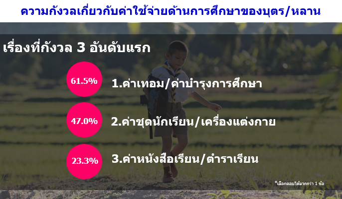 ทั้งนี้เมื่อสอบถามเรื่องที่ ประชาชนฐานรากมีความกังวลเกี่ยวกับค่าใช้จ่ายด้านการศึกษาของบุตร/หลาน พบว่า มีเพียงร้อยละ 29.1 ที่มีความกังวล โดย 3 อันดับแรก คือ เรื่องค่าเทอม/ค่าบำรุงการศึกษา (ร้อยละ 61.5) ค่าชุดนักเรียน/เครื่องแต่งกาย (ร้อยละ 47.0) และค่าหนังสือเรียน/ตำราเรียน (ร้อยละ 23.3)