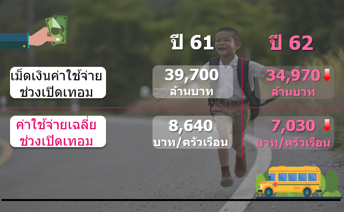 โดยภาพรวมการใช้จ่ายของประชาชนฐานรากในช่วงเปิดเทอม คาดว่าจะมีการจับจ่ายใช้สอยประมาณ 34,970 ล้านบาท ค่าใช้จ่ายเฉลี่ยต่อครัวเรือน อยู่ที่ 7,030 บาท ปรับลดลง จากปีที่แล้ว เนื่องจากกลุ่มตัวอย่างบางส่วนเลือกที่จะใช้ สิ่งของเดิมที่มีอยู่แล้ว อาทิเช่น ชุดนักเรียน อีกทั้งยังได้รับการสนับสนุนหนังสือเรียนจากโรงเรียน
