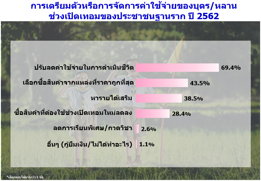 เมื่อสอบถามถึงการเตรียมตัวหรือการจัดการค่าใช้จ่ายของบุตร/หลาน ช่วงเปิดเทอมของประชาชนฐานราก พบว่า กลุ่มตัวอย่างได้มีการเตรียมตัวโดยการปรับลดค่าใช้จ่ายในการดำเนินชีวิต (ร้อยละ 69.4) เลือกซื้อสินค้าจากแหล่งที่ราคาถูกที่สุด (ร้อยละ 43.5) และหารายได้เสริม (ร้อยละ 38.5)