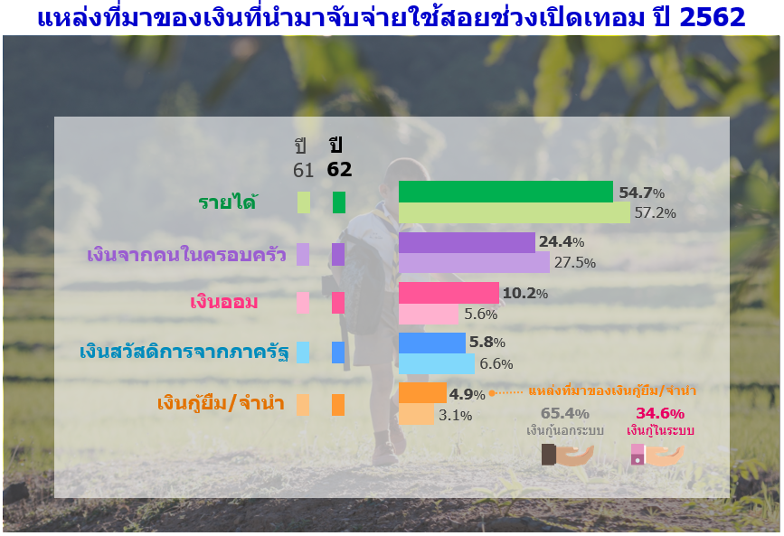 ส่วนแหล่งที่มาของเงินที่นำมาใช้จ่ายในช่วงเปิดเทอมปี 2562 พบว่า ส่วนใหญ่เกินครึ่งมาจากรายได้ (ร้อยละ 54.7) เงินจากคนในครอบครัว (ร้อยละ 24.4) เงินออม (ร้อยละ 10.2) เงินสวัสดิการจากภาครัฐ (ร้อยละ 5.8) และเงินกู้ยืม/จำนำ (ร้อยละ 4.9) ซึ่งมีทั้งเงินกู้นอกระบบและในระบบ อย่างไรก็ตามเมื่อเปรียบเทียบกับปีก่อน พบว่า กลุ่มตัวอย่างที่ต้องนำเงินที่ได้จากการเก็บออมมาใช้จ่ายในช่วงเปิดเทอม มีสัดส่วนเพิ่มขึ้นเกือบเท่าตัวจาก ปีก่อน นอกจากนี้การใช้เงินจากเงินกู้ก็มีสัดส่วนเพิ่มขึ้น โดยเป็นการกู้เงินจากนอกระบบมากกว่าในระบบ