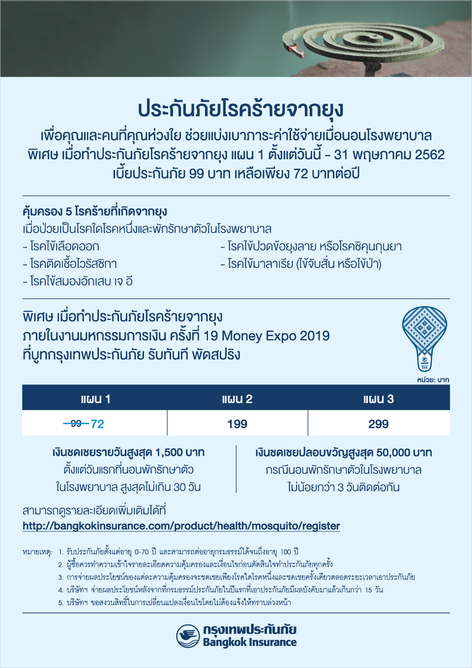 ภายในงานนี้ บริษัทฯ ได้จัดโปรโมชันที่มอบส่วนลดและของสมนาคุณอย่างเต็มที่ ทั้งประกันภัยรถยนต์ ประกันอัคคีภัย ประกันภัยอุบัติเหตุส่วนบุคคล รวมถึงโปรโมชันพิเศษสุดๆ ประกันภัยโรคร้ายจากยุง เบี้ยประกันภัยเหลือเพียง 72 บาทต่อปี จาก 99 บาทต่อปี พร้อมรับของสมนาคุณทันที ณ บูทกรุงเทพประกันภัย K6 อาคารชาเลนเจอร์ 2-3 อิมแพ็ค เมืองทองธานี ระหว่างวันที่ 16-19พฤษภาคม 2562 ![]()