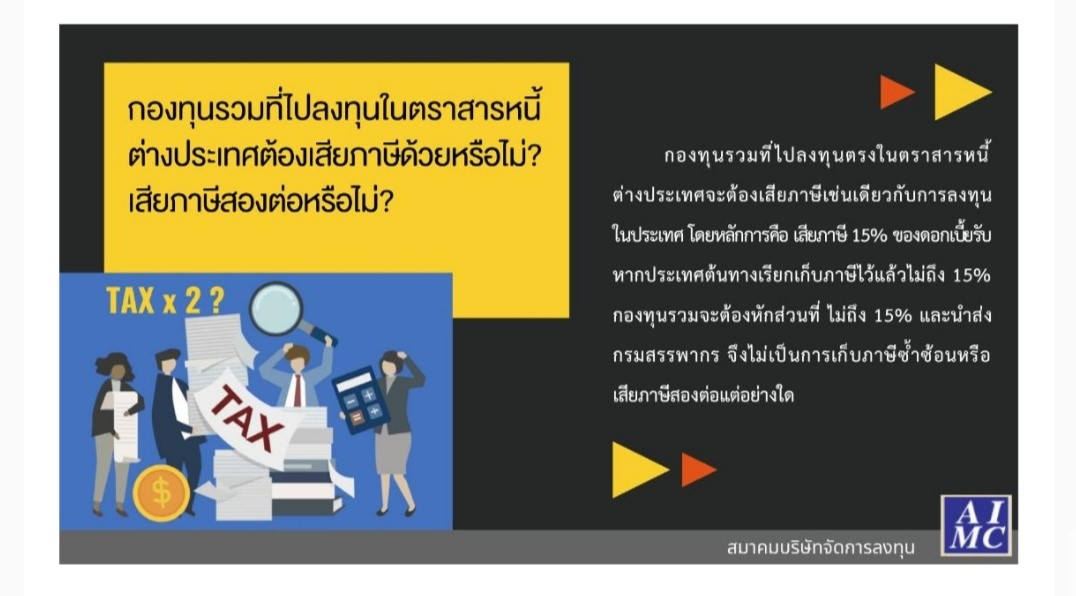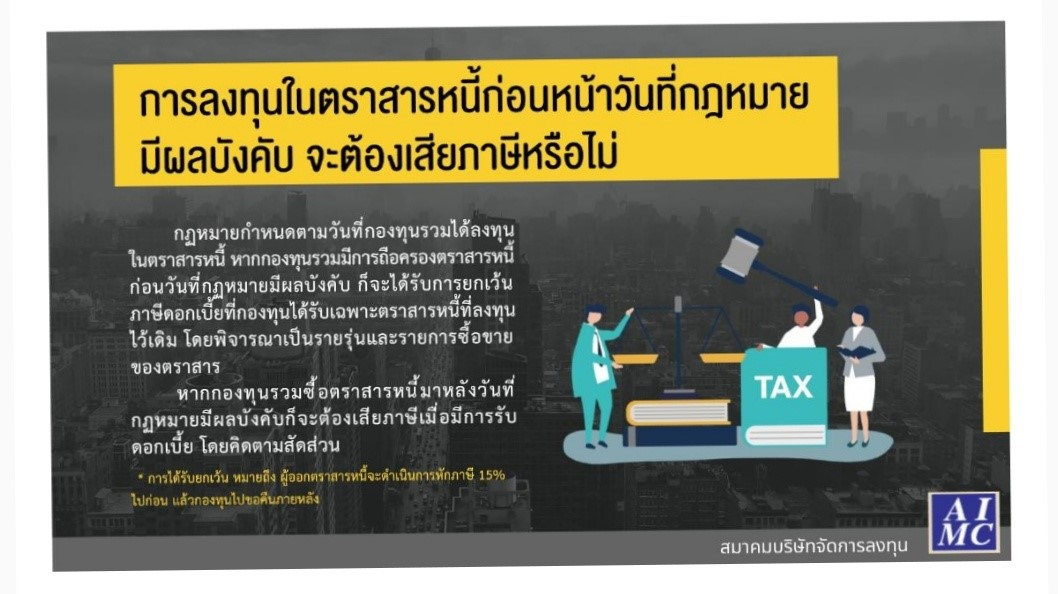 นายวศิน วณิชย์วรนันต์ นายกสมาคมบริษัทจัดการลงทุน (AIMC) กล่าวว่า การจัดเก็บภาษีเงินได้จากการลงทุนในตราสารหนี้ผ่านกองทุนรวม 15% ตามที่มีประกาศพระราชบัญญัติแก้ไขเพิ่มเติมประมวลรัษฎากร (ฉบับที่ ๕๒) พ.ศ. ๒๕๖๒ ได้ลงประกาศในราชกิจจานุเบกษาแล้ว จะมีผลใช้บังคับหลังจากประกาศภายใน 90 วัน โดยจะมีผลตั้งแต่วันที่ 20 ส.ค.2562 นี้ สำหรับประเด็นดังกล่าว ยืนยันว่า กระทบต่ออุตสาหกรรมกองทุนตราสารหนี้ที่อยู่ในระบบขณะนี้ 2.5 ล้านล้านบาทน้อยมาก เนื่องจากกองทุนตราสารหนี้ทุกประเภทที่เสนอขายไปก่อนหน้านี้รวมถึงกองทุนฯที่จะมีการเสนอขายก่อนวันที่ 20 ส.ค.2562 ที่อยู่ในช่วงระยะเวลา 90 วันตามที่พ.ร.บ.ฯกำหนด ได้รับการยกเว้นภาษีเหมือนเดิม