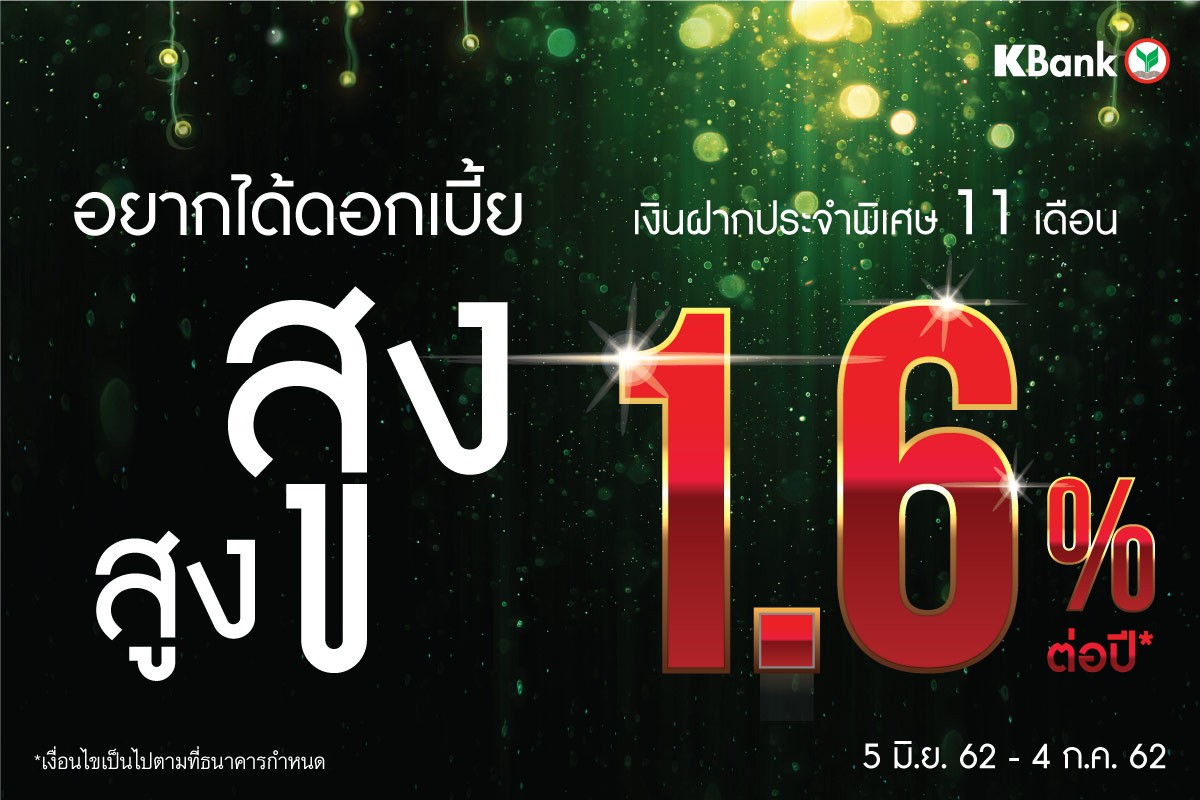 5 มิถุนายน 2562 : ธนาคารกสิกรไทย ออกแคมเปญ “เงินฝากประจำพิเศษ 11 เดือน” ให้ดอกเบี้ยสูง 1.6% ต่อปี รับดอกเบี้ยทุกเดือน กำหนดฝากขั้นต่ำ 200,000 บาทขึ้นไป เหมาะสำหรับผู้ที่ต้องการออมเงินและได้รับผลตอบแทนที่คุ้มค่า เปิดบัญชีได้ตั้งแต่วันนี้ ถึง 4 กรกฎาคม 2562 ที่ธนาคารกสิกรไทยทุกสาขา ดูรายละเอียดเพิ่มเติมที่เว็บไซต์ www.kasikornbank.com หรือ ติดต่อ K-Contact Center 02-8888888 ![]()