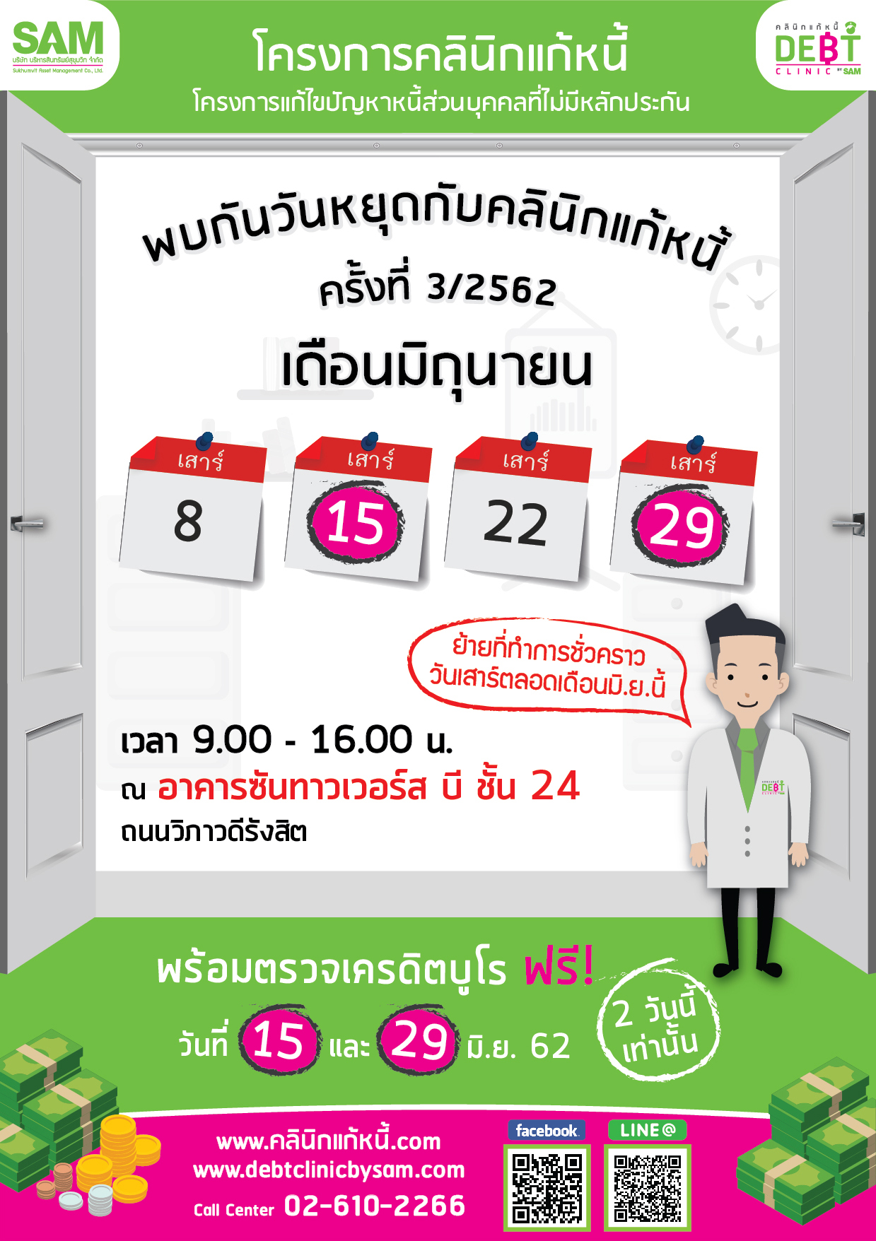 6 มิถุนายน 2553 : นายนิยต มาศะวิสุทธิ์ กรรมการผู้จัดการ บริษัท บริหารสินทรัพย์สุขุมวิท จำกัด (บสส.) หรือ SAM กล่าวว่า ทุกวันเสาร์ตลอดเดือนมิถุนายนนี้ คลินิกแก้หนี้จัดงาน “พบกันวันหยุดกับคลินิกแก้หนี้” เริ่มวันเสาร์ที่ 8, 15, 22 และ 29 มิถุนายน 2562 ตั้งแต่เวลา 9.00-16.00 น.