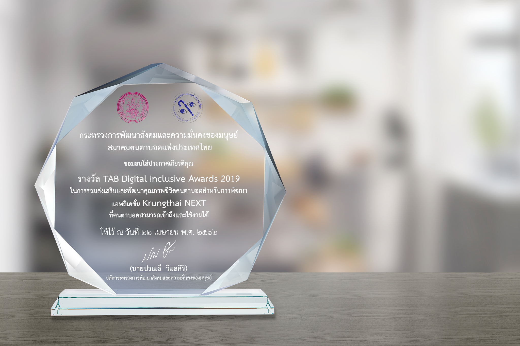โดยคำนึงถึงการเป็นมิตรกับผู้ใช้งานทุกคน ส่งผลให้ผู้พิการทางสายตาสามารถเข้าถึงธุรกรรมทางการเงินผ่านมือถือได้อย่างสะดวกสบาย ถูกต้องครบถ้วน ตามมาตรฐาน UI Accessibility Guideline ของระบบปฏิบัติการ iOS และ Android โดยผู้พิการทางสายตาทั่วประเทศได้โหวตให้ กรุงไทย NEXT เป็นโมบายแบงก์กิ้งที่สามารถใช้งานได้สะดวกสบายที่สุด จนได้รับรางวัล Tab Digital Inclusive Awards 2019 จากสมาคมคนตาบอดแห่งประเทศไทย”