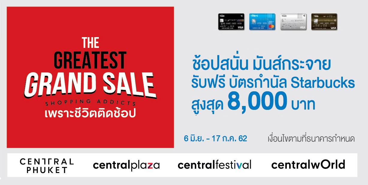 11 มิถุนายน 2562 : บัตรเครดิตทีเอ็มบีมอบบัตรกำนัล Starbucks สูงสุด 8,000 บาท ฟรี เพียงใช้จ่ายผ่านบัตรที่ศูนย์การค้า เซ็นทรัลเวิลด์, เซ็นทรัลพลาซา, เซ็นทรัลเฟสติวัล และเซ็นทรัลภูเก็ต ยอดใช้จ่าย 4,000-9,999 บาท/เซลล์สลิป รับบัตรกำนัล Starbucks 100 บาท ยอดใช้จ่าย 10,000-29,999 บาท/เซลล์สลิป รับบัตรกำนัล Starbucks 300 บาท ยอดใช้จ่าย 30,000-49,999 บาท/เซลล์สลิป รับบัตรกำนัล Starbucks 1,000 บาท ยอดใช้จ่าย 50,000-99,999 บาท/เซลล์สลิป รับบัตรกำนัล Starbucks 1,800 บาท ยอดใช้จ่าย 100,000 บาทขึ้นไป/เซลล์สลิป รับบัตรกำนัล Starbucks 4,000 บาท จำกัดรับบัตรกำนัล Starbucks สูงสุด 4,000 บาทต่อศูนย์การค้าที่ร่วมรายการ และสูงสุด 8,000 บาท/บัตร ตลอดรายการ ระยะเวลาโปรโมชั่นตั้งแต่วันที่ 6 มิ.ย. – 17 ก.ค. 62 ช้อปแล้วอย่าลืมแบ่งจ่ายกับ ทีเอ็มบี โซกู๊ด แบ่งจ่ายได้ทุกอย่าง 0% 3 เดือน (ขั้นต่ำ 1,000 บาท/ เซลล์สลิป) เพียงรูดแล้วโทร.1558 กด 1 ตามด้วย 01 หรือ เลือกทำรายการด้วยตนเองผ่าน TMB TOUCH/ TMB Internet Banking ก่อนวันสรุปยอดบัญชี สอบถามรายละเอียดเพิ่มเติมที่ TMB Contact Center โทร. 1558 ![]()