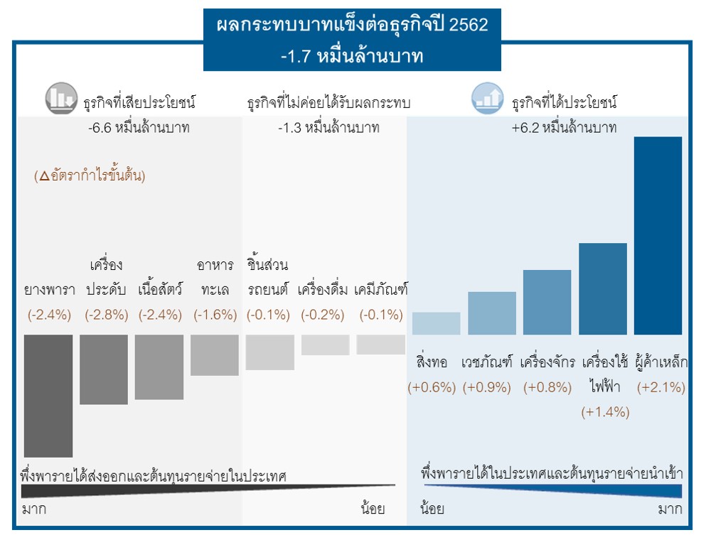 1.ธุรกิจที่เสียประโยชน์ พบว่าธุรกิจที่พึ่งพารายได้จากการส่งออกและใช้วัตถุดิบภายในประเทศเป็นหลัก จะได้ผลกระทบมากที่สุดจาก ทำให้รายได้ผู้ประกอบการหายไปกว่า 6.6 หมื่นล้านบาท ซึ่งกระทบต่ออัตรากำไรขั้นต้น ลดลงจากระดับปกติ 0.3 – 3.2% กลุ่มธุรกิจที่ถูกกระทบมากที่สุด ได้แก่ ผลิตภัณฑ์ยางพารา อาหารทะเล เนื้อสัตว์ และเครื่องประดับ