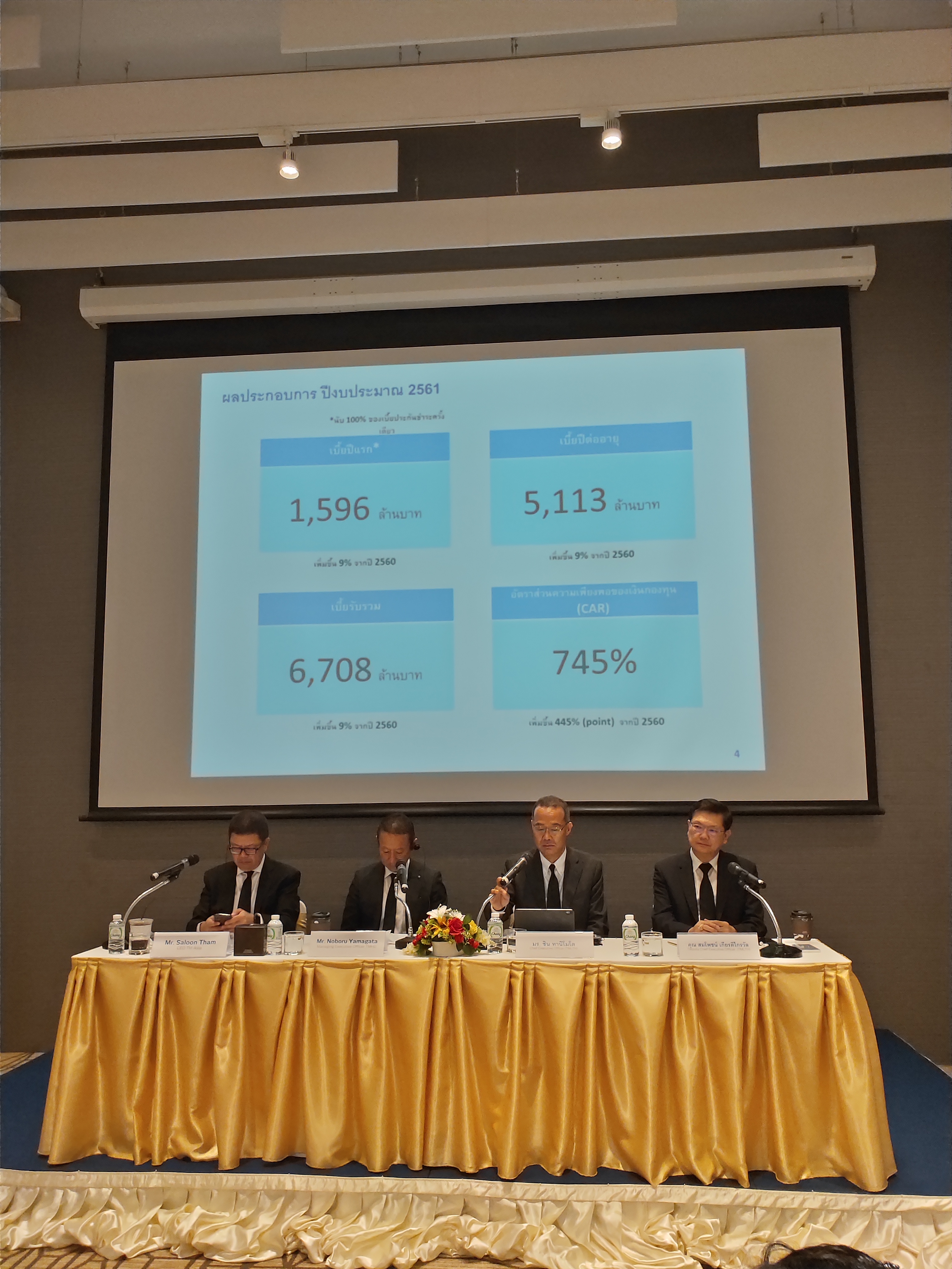 จะพบว่าบริษัทมีอัตราส่วนเงินกองทุนต่อเงินกองทุนที่ต้องดำรงตามกฎหมาย (CAR) 745% ซึ่งสูงกว่าค่ามาตรฐานขั้นต่ำที่กำหนดไว้ 140% เรามีการควบคุมค่าใช้จ่ายและการบริหารจัดการที่ดี ที่ทำให้ลูกค้าได้รับผลิตภัณฑ์ที่ดี โครงสร้างผลตอบแทนของตัวแทนเป็นที่น่าพอใจ และบริษัทมีกำไรจากการดำเนินงาน จากรายงานตัวเลขในงบกำไรขาดทุนปี 2561 จะพบว่าปัจจุบันบริษัทมีกำไรสะสมจำนวน 949 ล้านบาท และมีสินทรัพย์รวมทั้งสิ้น 24,344 ล้านบาท