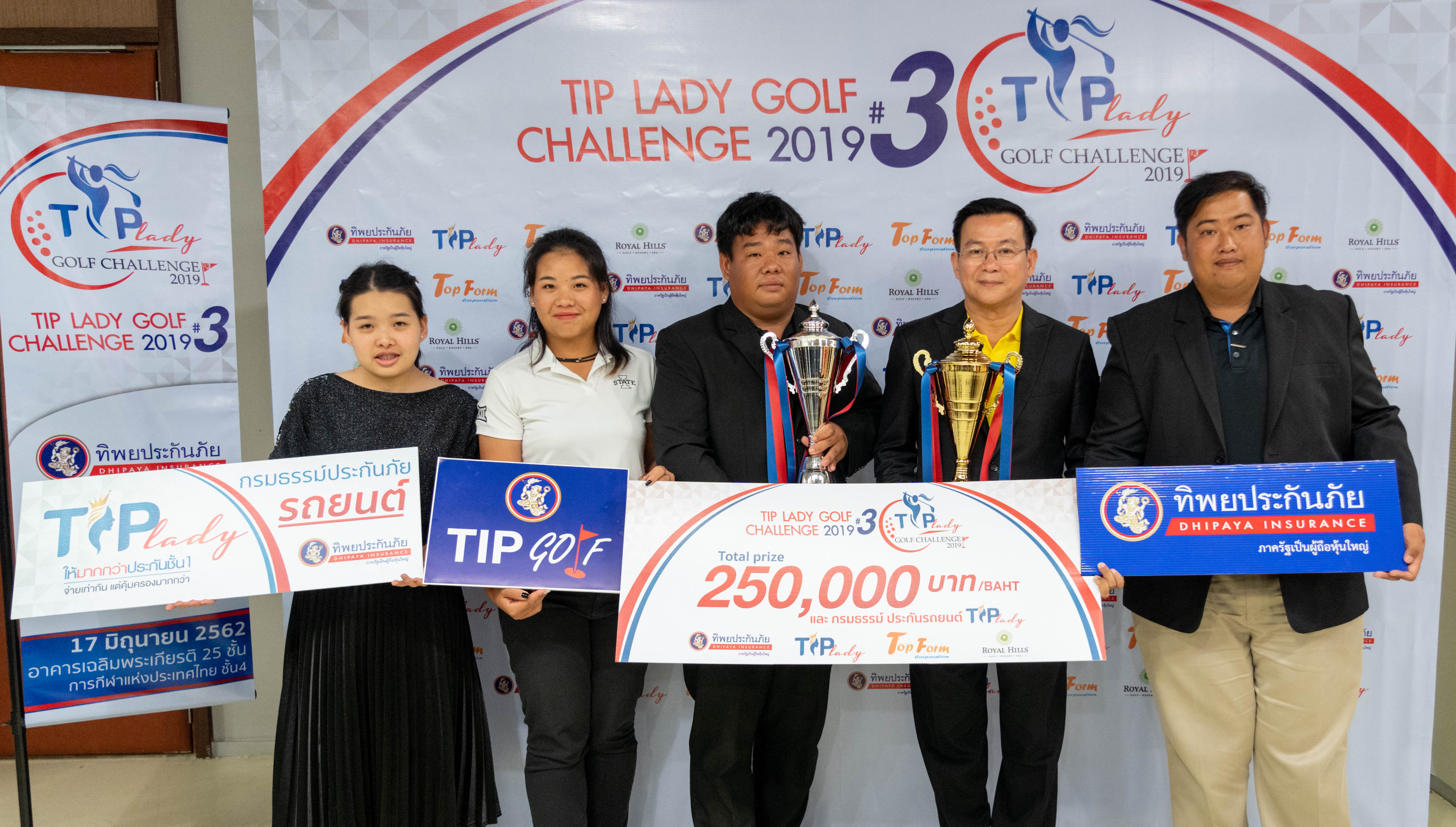 17 มิถุนายน 2562 : ดร.สมพร สืบถวิลกุล กรรมการผู้จัดการใหญ่ ทิพยประกันภัย แถลงข่าวการจัดการแข่งขัน กอล์ฟสตรี รายการ “Tip Lady Golf Challenge” ครั้งที่ 3 ซึ่งเป็นการแข่งขันแบบ One day tour สำหรับนักกอล์ฟสตรี รายการแรกของประเทศไทย ชิงเงินรางวัลรวมกว่า 250,000 บาท เพื่อให้นักกอล์ฟสตรีทั้งมืออาชีพและมือสมัครเล่น ได้มีรายการแข่งขันที่มีมาตรฐานระดับสากล เพื่อพัฒนาศักยภาพไปสู่ระดับที่สูงขึ้น โดยมอบหมายให้บริษัทท็อปฟอร์ม คอร์ปอร์เรชั่น จำกัด เป็นผู้ดำเนินการจัดการแข่งขัน สำหรับการแข่งขัน จะจัดขึ้นในวันจันทร์ที่ 1 กรกฎาคม 2562 ณ สนามกอล์ฟ รอยัลฮิลล์ กอล์ฟ รีสอร์ต แอนด์ สปา จ.นครนายก