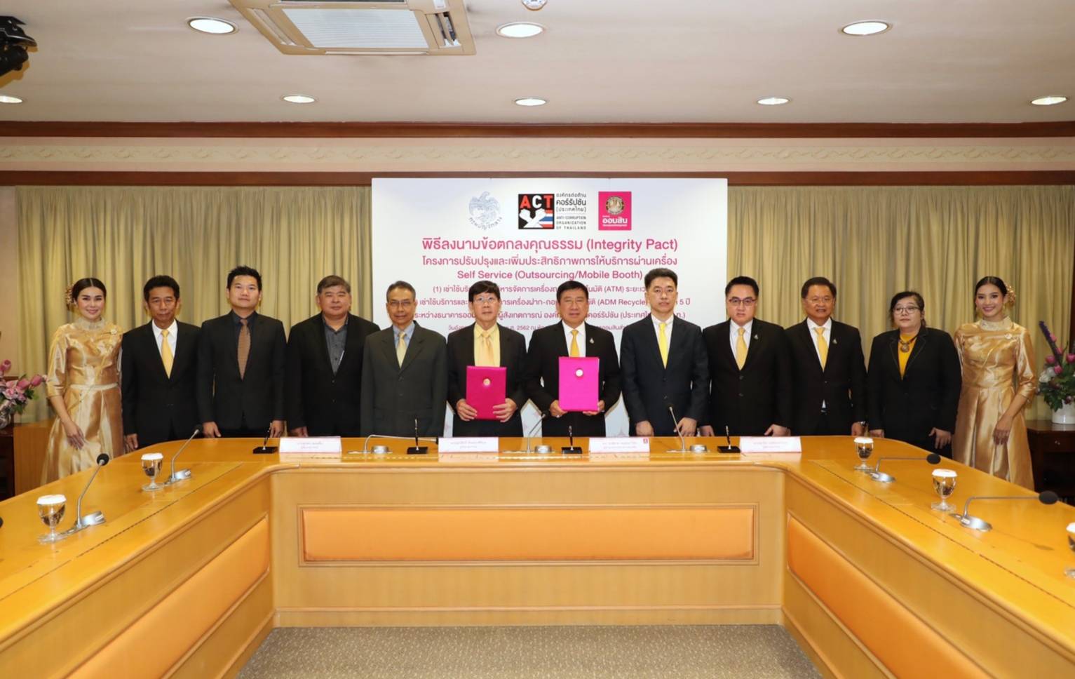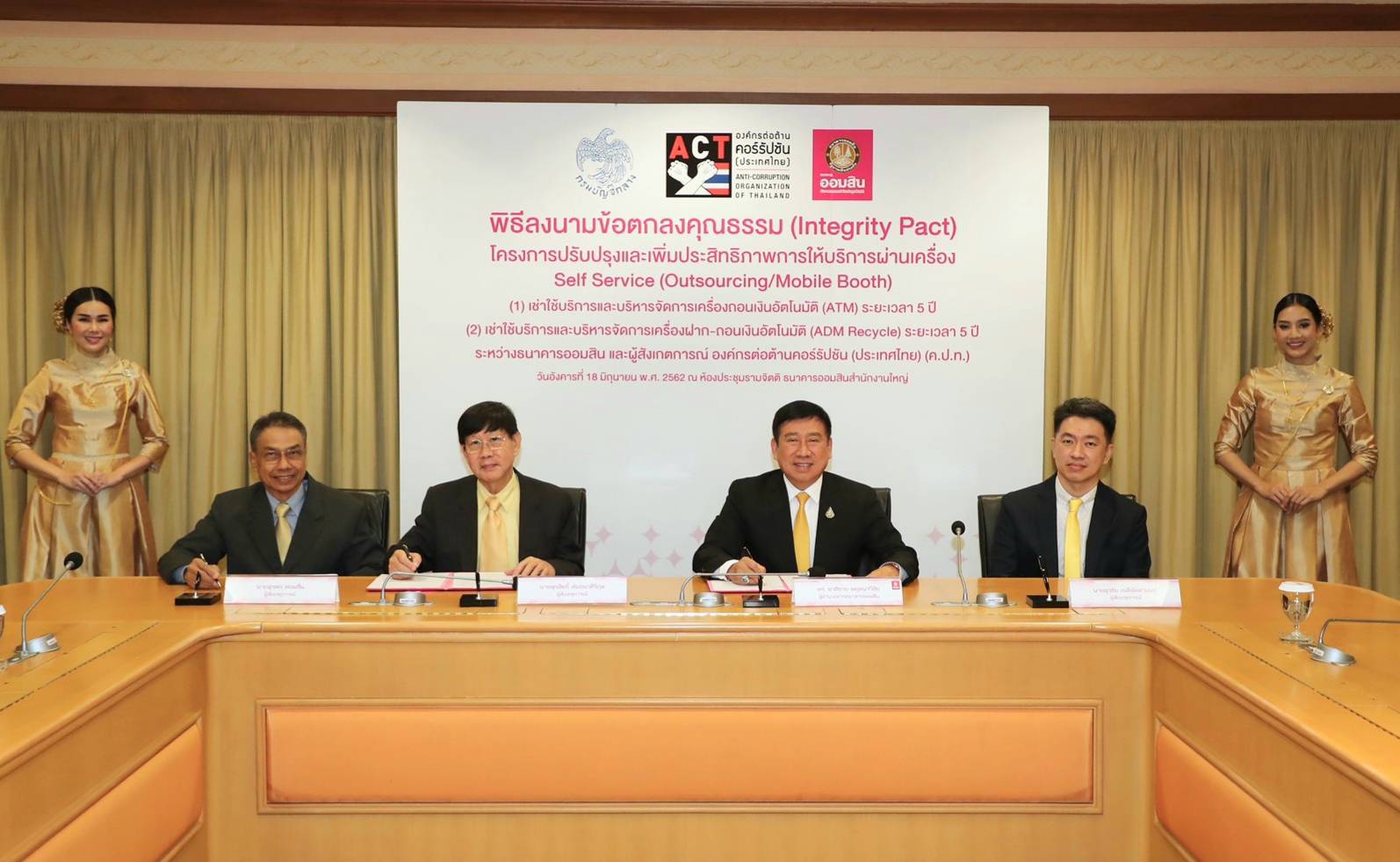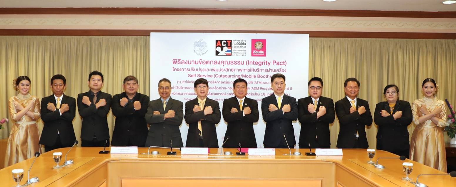 18 มิถุนายน 2562 : ดร.ชาติชาย พยุหนาวีชัย ผู้อำนวยการธนาคารออมสิน และคณะผู้สังเกตการณ์ องค์กรต่อต้านคอร์รัปชัน (ประเทศไทย) ร่วมแถลงข่าวในพิธีลงนามข้อตกลงคุณธรรม (Integrity Pact) “โครงการปรับปรุงและเพิ่มประสิทธิภาพการให้บริการผ่านเครื่อง Self Service (Outsourcing/Mobile Booth)” เพื่อเพิ่มประสิทธิภาพการใช้จ่ายเงินงบประมาณ ยกระดับความโปร่งใสของโครงการจัดซื้อจัดจ้างภาครัฐ และสร้างความเชื่อมั่นให้กับภาคเอกชนที่จะเข้าร่วมเสนอราคาในโครงการ ซึ่งจะก่อให้เกิดการแข่งขันอย่างเป็นธรรมและเกิดประโยชน์สูงสุดต่อประเทศชาติอย่างแท้จริง