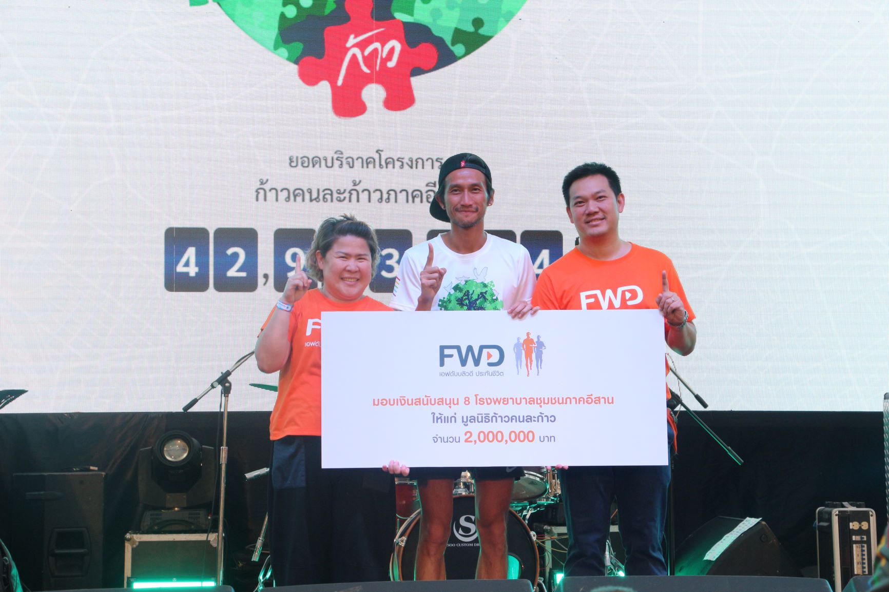 19 มิถุนายน 2562 : ปรีชา รุธิรพงษ์ (คนที่ 3 จากซ้าย) ประธานเจ้าหน้าที่สายงานการตลาด และ ศุลีพร ยงวิทิตสถิต (คนที่ 1 จากซ้าย) ผู้อำนวยการสื่อสารองค์กรและกิจกรรมทางการตลาด บริษัท เอฟดับบลิวดี ประกันชีวิต จำกัด (มหาชน) ร่วมมอบเงินสนับสนุนให้กับมูลนิธิก้าวคนละก้าว จำนวน 2,000,000 บาท เพื่อสมทบทุนให้กับ 8 โรงพยาบาลชุมชนภาคอีสาน โดยมี นายอาทิวราห์ คงมาลัย (ตูน) รับมอบ ณ สนามกีฬากลาง จังหวัดขอนแก่น ![]()