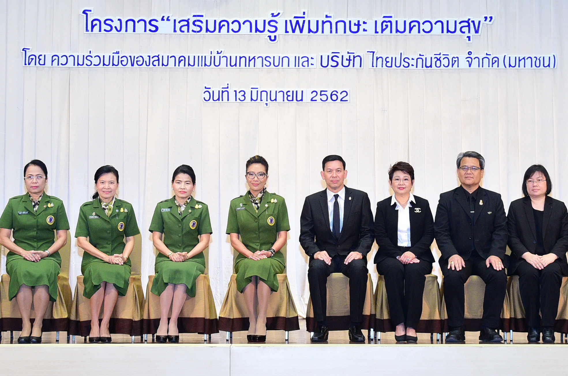 21 มิถุนายน 2562 : รศ.ดร.กฤษติกา คงสมพงษ์ นายกสมาคมแม่บ้านทหารบก พร้อมด้วยนายอังกูร ศรีกัลยาณบุตร รองกรรมการผู้จัดการใหญ่ และ Chief Marketing Officer บริษัท ไทยประกันชีวิต จำกัด (มหาชน) ร่วมเปิดโครงการ “เสริมความรู้ เพิ่มทักษะ เติมความสุข” เพื่อเสริมความรู้และทักษะด้านอาชีพเสริมรายได้แก่สมาชิกแม่บ้านทหารบก กลุ่มกำลังพลที่ปลดประจำการและครอบครัว สังกัดกองทัพภาคที่ 1 ณ ห้องมัฆวานรังสรรค์ สโมสรทหารบก ![]()