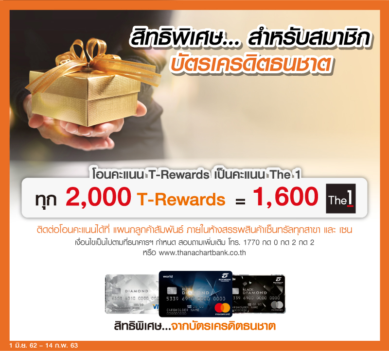 21 มิถุนายน 2562 : ธนาคารธนชาต จำกัด (มหาชน) มอบสิทธิพิเศษให้ลูกค้าบัตรเครดิตธนชาตที่เป็นสมาชิก The 1 Card ใช้คะแนน T-Rewards ทุกๆ 2,000 คะแนน โอนเป็นคะแนน The 1 ได้ 1,600 คะแนน เพื่อนำไปใช้เป็นส่วนลดสำหรับ ช้อปปิ้งสินค้าในเครือเซ็นทรัล หรือใช้แลกเป็นส่วนลดสินค้าบริการต่างๆ โดยสามารถติดต่อรับสิทธิ์โอนคะแนนได้ที่ แผนกลูกค้าสัมพันธ์ ภายในห้างสรรพสินค้าเซ็นทรัลทุกสาขา และเซน ได้ตั้งแต่วันนี้ – 14 ก.พ. 2563 ![]()