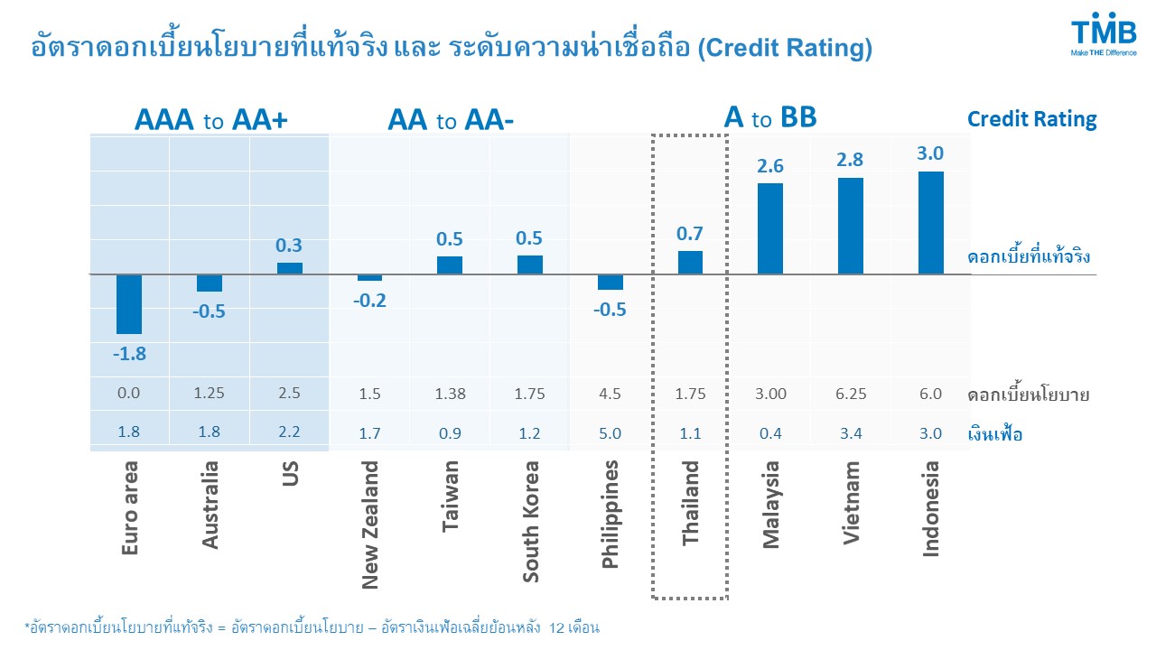 แน่นอนว่าหากเทียบกับประเทศเศรษฐกิจหลักอย่างสหรัฐฯ อัตราดอกเบี้ยนโยบายที่แท้จริงของไทยยังอยู่ในระดับที่สูงกว่า โดยคำนวณจากอัตราดอกเบี้ยนโยบายหักลบด้วยอัตราเงินเฟ้อเฉลี่ย จะอยู่ที่ระดับประมาณ 0.67% สูงกว่าของสหรัฐฯ ที่ 0.23% อย่างไรก็ตาม ระดับดอกเบี้ยดังกล่าวถือว่าสอดคล้องกับการจัดอันดับความน่าเชื่อถือ หรือ Credit Rating ของประเทศแล้ว เพราะโดยปกติประเทศที่อันดับความน่าเชื่อถือต่ำกว่าหรือมีความเสี่ยงมากกว่าก็ควรให้ผลตอบแทนที่สูงกว่าเพื่อชดเชยความเสี่ยงดังกล่าว ซึ่งไทยถูกจัดอันดับความน่าเชื่อที่อยู่ที่ระดับ BBB+ ต่ำกว่า AA+ ของสหรัฐฯ ถึง 6 ระดับ จึงถือเป็นเรื่องปกติที่อัตราดอกเบี้ยนโยบายที่แท้จริงของไทยจะอยู่สูงกว่าของสหรัฐฯ