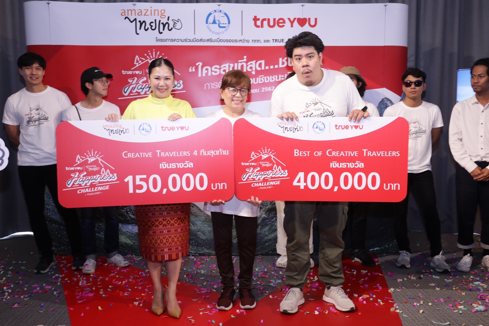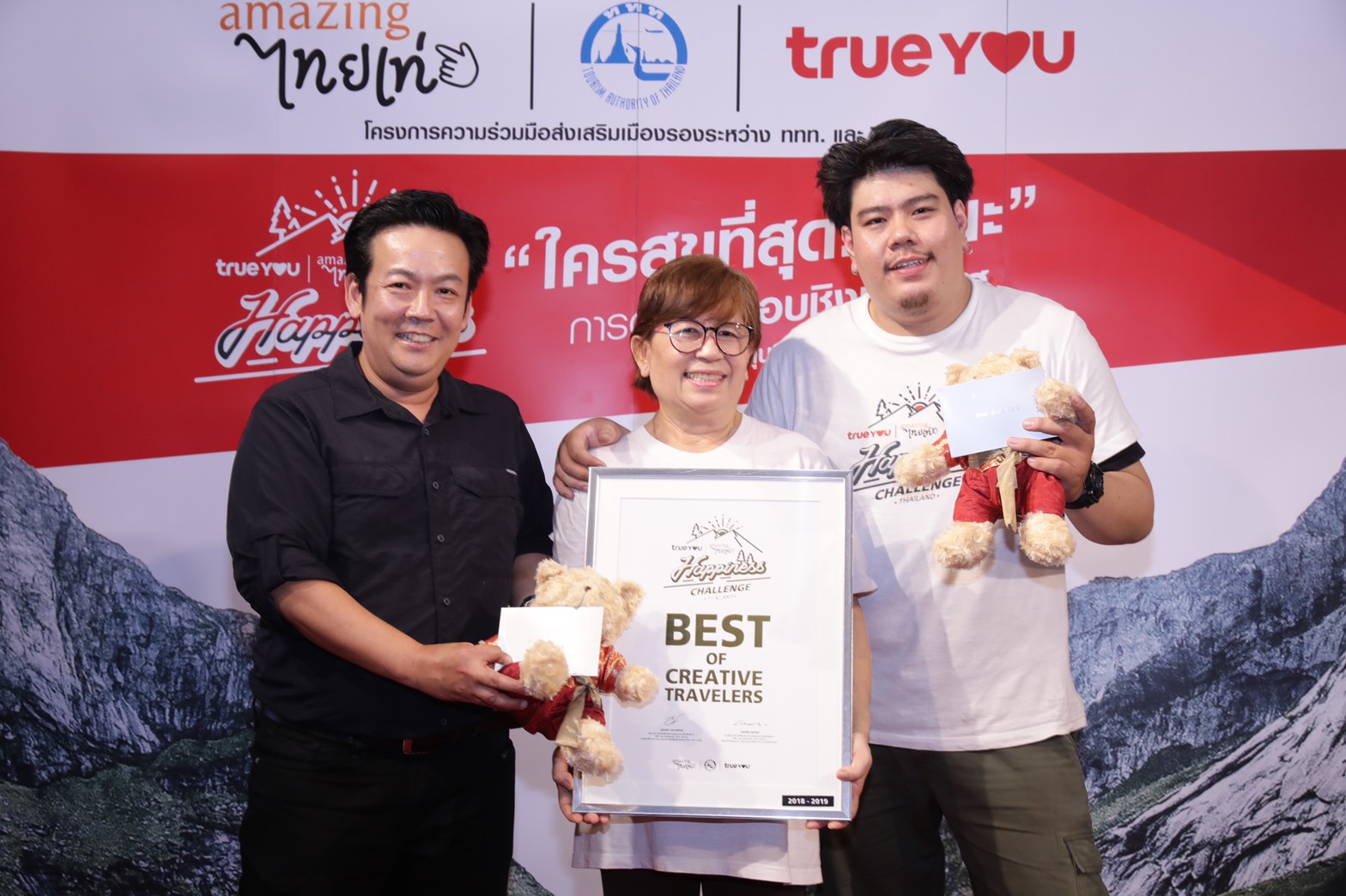 24 มิถุนายน 2562 : การท่องเที่ยวแห่งประเทศไทย (ททท.) ร่วมกับกลุ่มทรู ประกาศผลสุดยอดทีมเจ้าของผลงานคลิปรายการออนไลน์ ที่นำเสนอมนต์เสน่ห์แห่งการเดินทางเยือน 16 จังหวัดเมืองรองใน 4 ภาคทั่วไทยได้อย่างสุข สนุก และสร้างสรรค์ กับแคมเปญ “TrueYou Happiness Challenge Thailand ใครสุขที่สุด…ชนะ” จากผู้เข้าแข่งขันกว่า 300 ทีมจากทั่วประเทศ คัดเหลือ 4 ทีมสุดท้าย เพื่อร่วมหาทีมชนะเลิศ พิชิตเงินรางวัลรวมมูลค่า 1 ล้านบาท