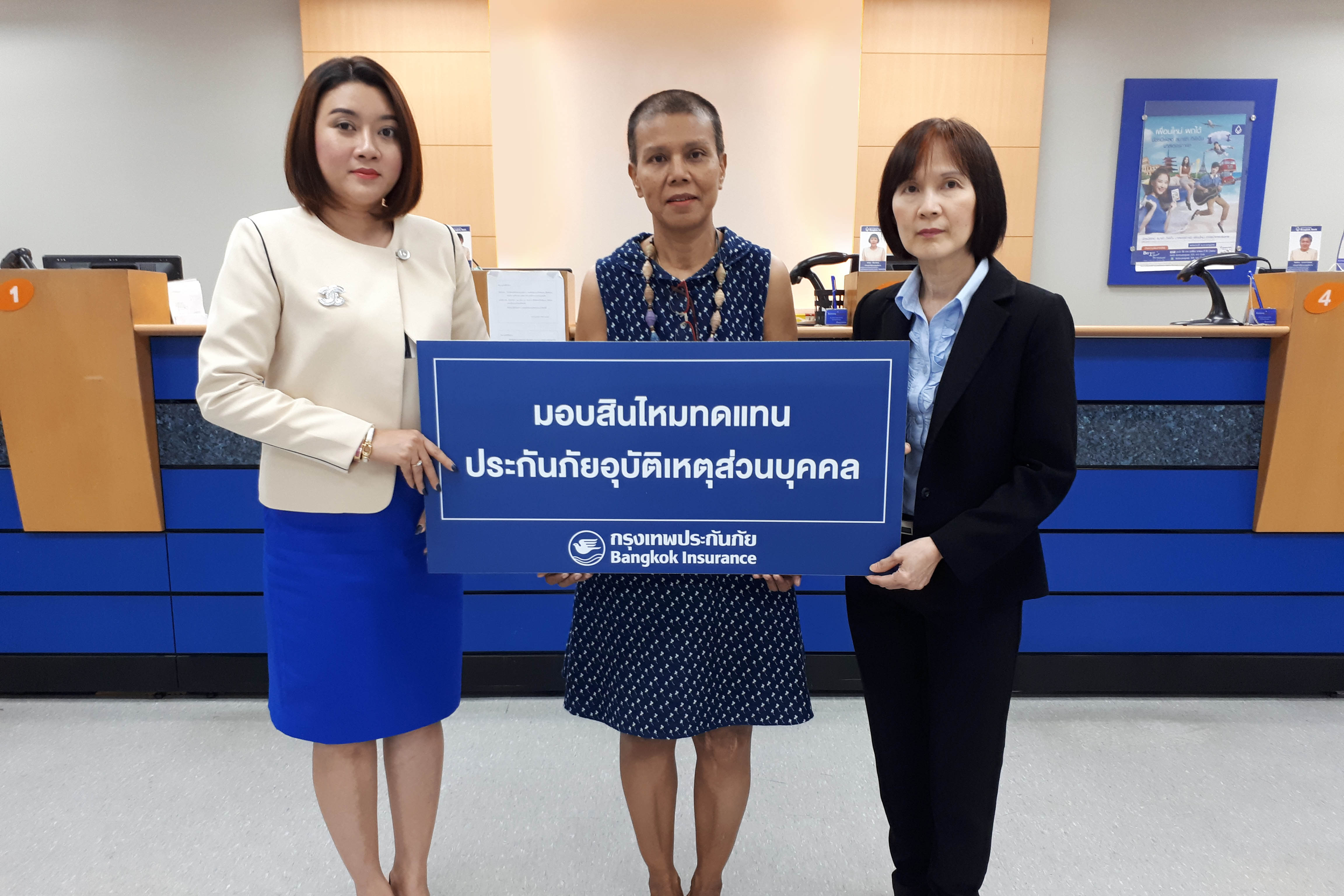 25 มิถุนายน 2562 : บริษัท กรุงเทพประกันภัย จำกัด (มหาชน) หรือ BKI โดยนางสุรีย์พร สีอุไรย์ (ขวาสุด) ผู้จัดการสาขาขอนแก่น ธุรกิจสาขาและการร่วมทุน และนางวายุธิดา ชาบรรทม (ซ้ายสุด) ผู้จัดการสาขาขอนแก่น บมจ.ธนาคารกรุงเทพ ร่วมมอบสินไหมทดแทนประกันภัยอุบัติเหตุส่วนบุคคล จำนวนเงิน 1,200,000 บาท ให้แก่ นางนิตยา ลีกิสต์ (กลาง) ผู้รับประโยชน์ซึ่งเป็นภรรยาของนายธีโอดอร์ ลีกิสต์ ผู้เอาประกันภัยที่เสียชีวิตจากอุบัติเหตุหกล้ม ณ ธนาคารกรุงเทพ สาขาขอนแก่น เมื่อเร็วๆ นี้ ![]()