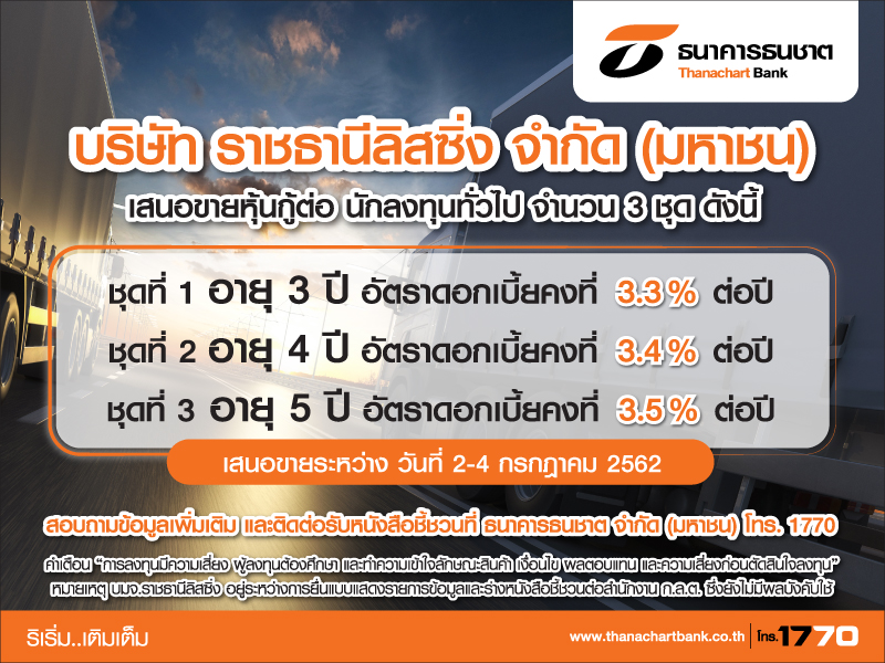 26 มิถุนายน 2562 : รายงานข่าวจาก ธนาคารธนชาต จำกัด (มหาชน) เปิดเผยว่า ธนาคารฯ ได้รับแต่งตั้งเป็นผู้จัดการการจำหน่ายและรับประกันการจำหน่าย หุ้นกู้ บริษัท ราชธานีลิสซิ่ง จำกัด (มหาชน) จำนวน 3 ชุด ประกอบด้วย หุ้นกู้ ชุดที่ 1 อายุ 3 ปี อัตราดอกเบี้ยคงที่ 3.30% ต่อปี ชุดที่ 2 อายุ 4 ปี อัตราดอกเบี้ยคงที่ 3.40% ต่อปี ชุดที่ 3 อายุ 5 ปี อัตราดอกเบี้ยคงที่ 3.50% ต่อปี โดยหุ้นกู้ทั้ง 3 ชุด จะจ่ายดอกเบี้ยทุก 3 เดือน จองซื้อขั้นต่ำ 100,000 บาท และทวีคูณ 100,000 บาท เปิดให้นักลงทุนทั่วไป จองได้ ระหว่างวันที่ 2 ถึง 4 กรกฎาคม นี้ ที่ธนาคารธนชาตทุกสาขา
