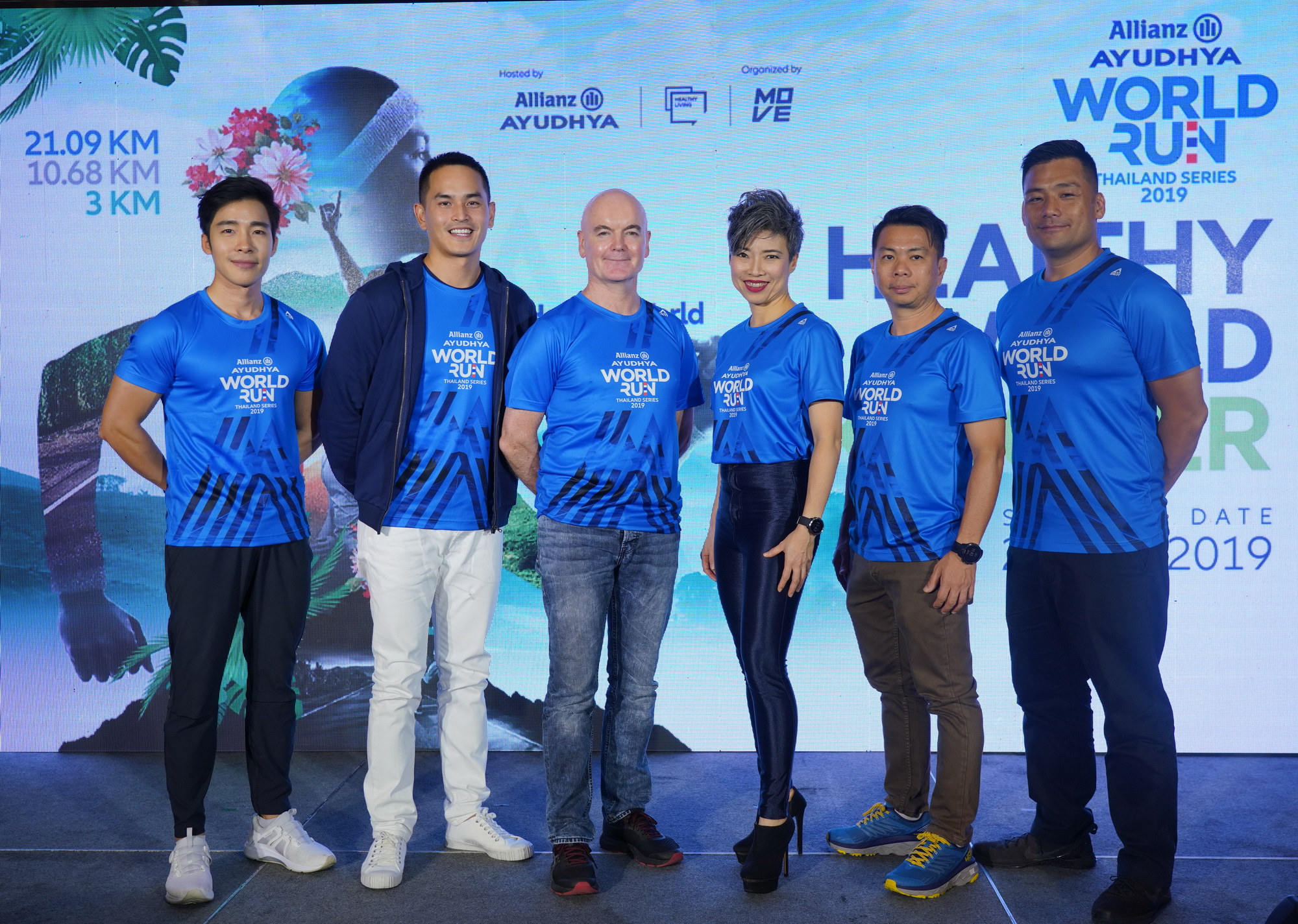 26 มิถุนายน 2562 : ไบรอัน สมิธ (ที่สามจากซ้าย) กรรมการผู้จัดการใหญ่และประธานเจ้าหน้าที่บริหาร และ พัชรา ทวีชัยวัฒนะ (ที่สามจาก ขวา) รองกรรมการผู้จัดการใหญ่ฝ่ายสายงานบริหารงานลูกค้า บมจ. อลิอันซ์ อยุธยา ประกันชีวิต ประกาศความร่วมมือจัดงานวิ่งครั้งยิ่งใหญ่แห่งปี “Allianz Ayudhya World Run Thailand Series 2019” ภายใต้แนวคิด “Healthy World Explorer” เปิดประสบการณ์การวิ่งในเส้นทางที่สวยงามของเขาใหญ่ โดยมี สงกรานต์ เตชะณรงค์(ที่สองจากซ้าย) ผู้บริหาร พาโค่ โฮเทล บาย โบนันซ่า บุญเพิ่ม อินทนปสาธน์ (ที่สองจากขวา) ประธานเจ้าหน้าที่บริหาร บริษัท มูฟ เอเชีย จำกัด ทาคายูกิ คูชิดะ(ขวา) ประธาน บริษัท โอซูก้า นิวทราซูติคอล (ประเทศไทย) จำกัด และ ณัฐ ศักดาทร(ซ้าย) ตัวแทนกลุ่มนักวิ่ง ในฐานะพันธมิตรร่วมงาน ณ โรงแรมเรเนซองส์ กรุงเทพฯ