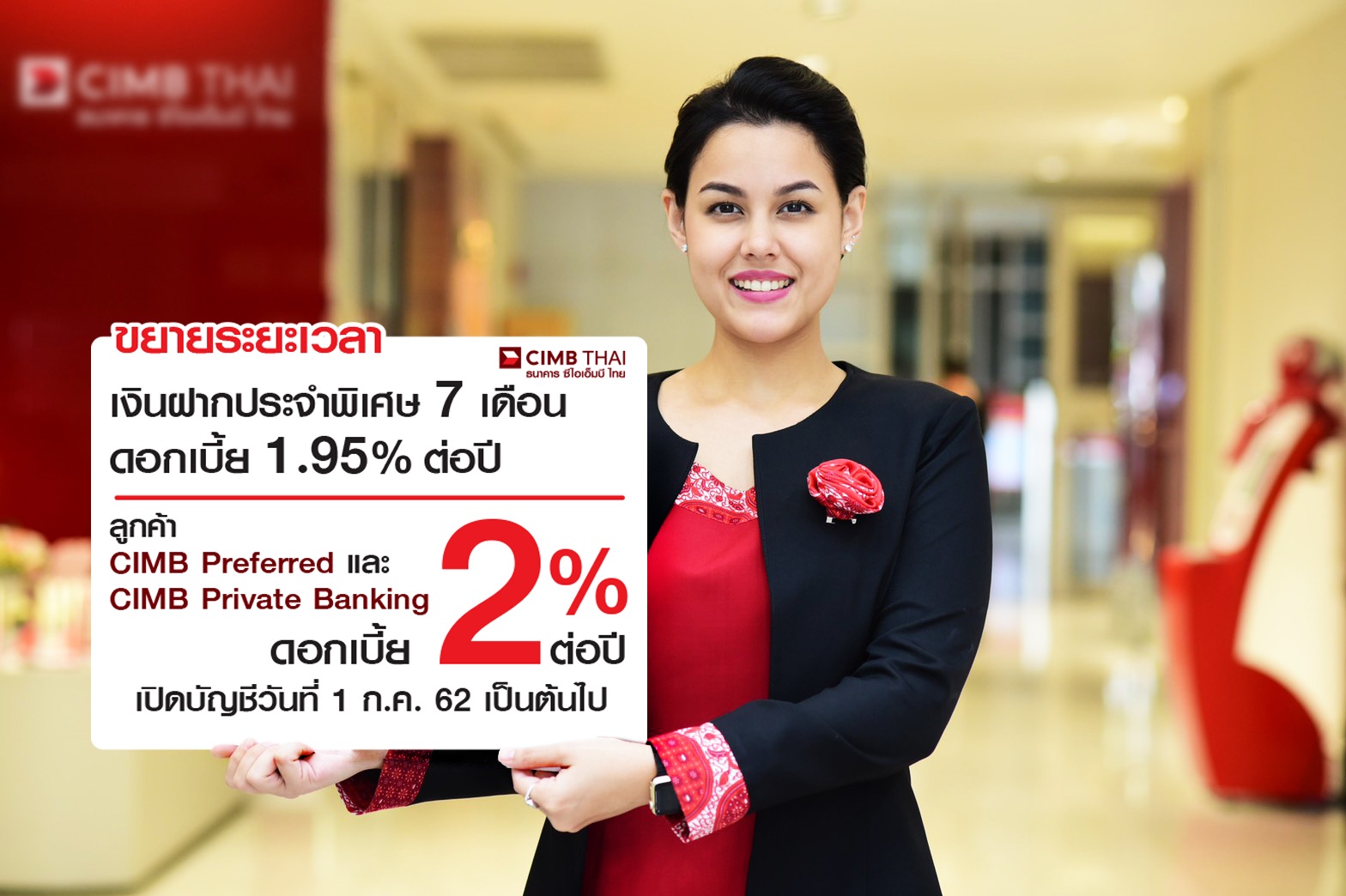 3 กรกฎาคม 2562 : ธนาคาร ซีไอเอ็มบี ไทย ขยายระยะเวลาโปรแกรมเงินฝากประจำพิเศษ 7 เดือน ดอกเบี้ย 1.95% ต่อปี และพิเศษสำหรับลูกค้า CIMB Preferred และ CIMB Private Banking ดอกเบี้ย 2% ต่อปี โดยมีผลตั้งแต่วันที่ 1 ก.ค. 62 เป็นต้นไป และจะเปิดรับฝากจนกว่าจะมียอดเงินฝากรวมของโครงการครบวงเงินที่ธนาคารกำหนดไว้