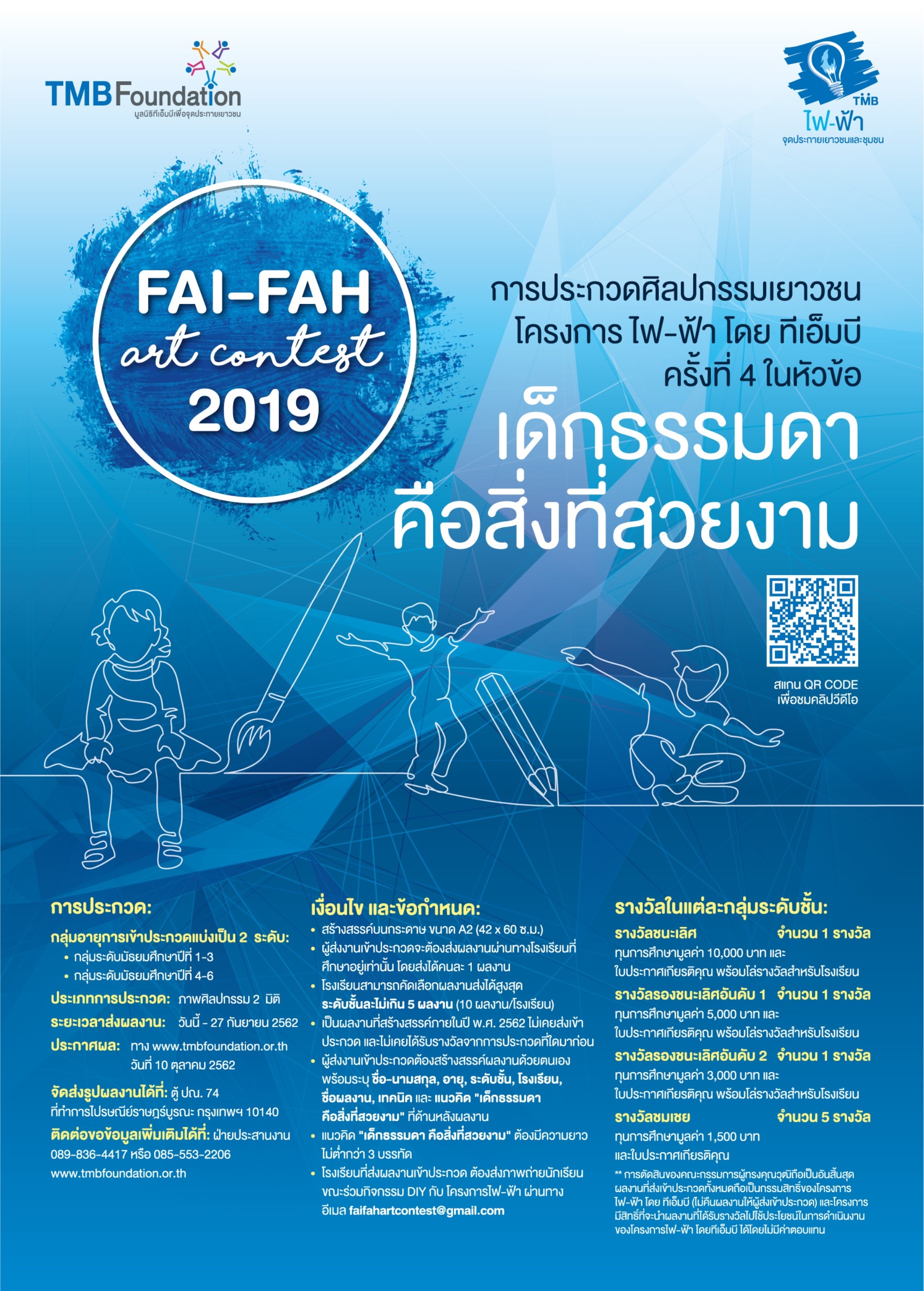 9 กรกฎาคม 2562 : มูลนิธิทีเอ็มบี ร่วมส่งต่อพลังศิลปะ จุดประกายเยาวชนเพื่อชุมชน ขอเชิญชวนน้องๆเยาวชน นักเรียนผู้มีใจรักงานศิลปะ เข้าร่วมกิจกรรรม FAI-FAH Art Contest 2019 พร้อมสร้างสรรค์และส่งผลงานเข้าร่วมการประกวดศิลปกรรมเยาวชน จัดโดยโครงการไฟ-ฟ้า จากทีเอ็มบี ครั้งที่ 4” ในหัวข้อ “เด็กธรรมดา คือสิ่งที่สวยงาม” เพื่อส่งเสริมให้เยาวชนได้นำเสนอมุมมองและความคิดสร้างสรรค์ผ่านผลงานศิลปะ จุดประกายให้เกิดการเปลี่ยนแปลงอย่างยั่งยืน พร้อมชิงทุนการศึกษามูลค่ารวมกว่า 25,000 บาท ใบประกาศเกียรติคุณและโล่รางวัลสำหรับโรงเรียน