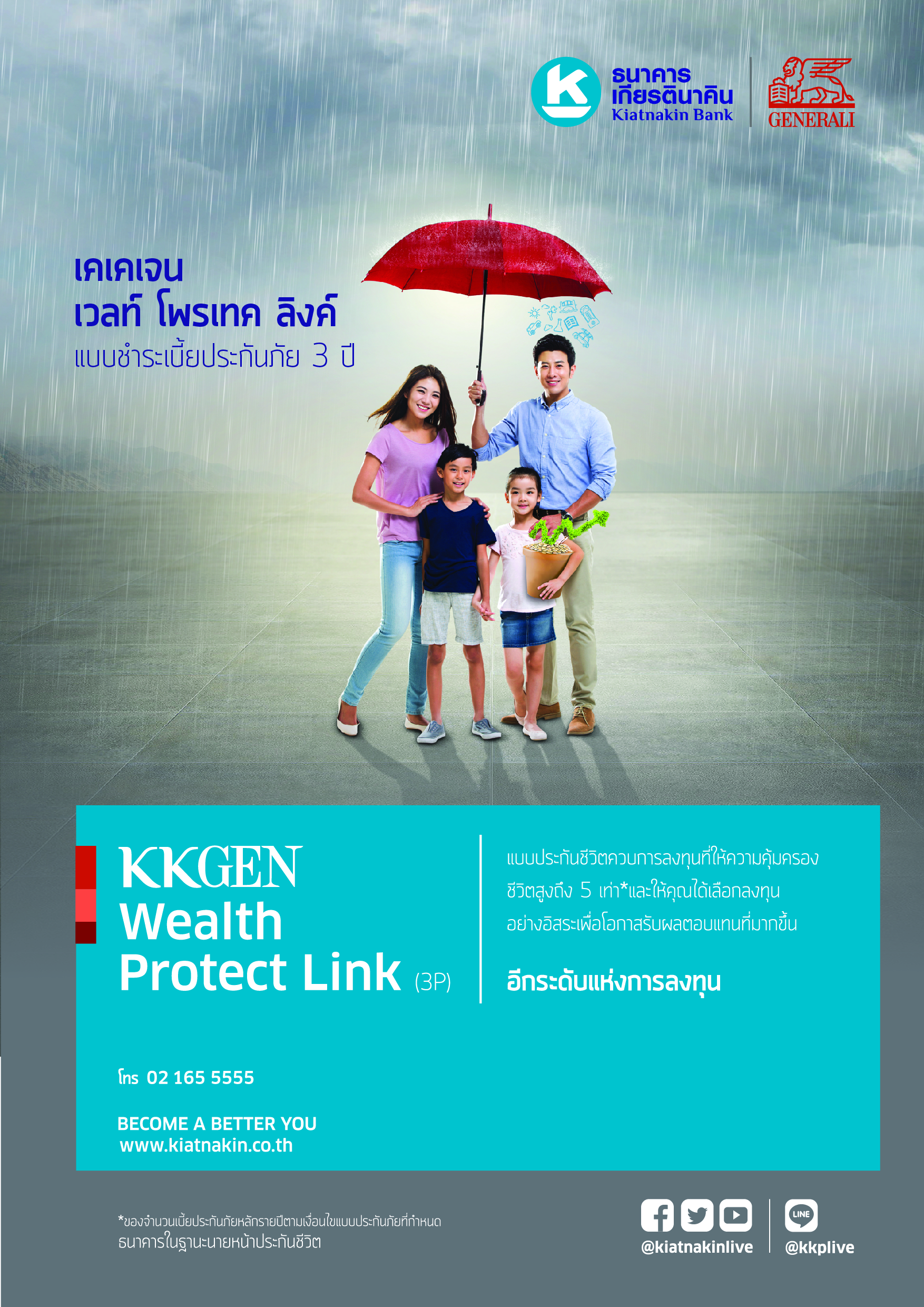 ส่วน เคเคเจน เวลท์ โพรเทค ลิงค์ แบบชำระเบี้ยประกันภัย 3 ปี เหมาะสำหรับผู้ที่ต้องการเน้นความคุ้มครองควบคู่การลงทุน และต้องการแบ่งชำระเบี้ยประกันภัยเป็นรายงวด มีความคุ้มครองชีวิตสูงถึง 5 เท่า ของเบี้ยประกันภัยหลักรายปี (ขึ้นอยู่กับอายุของผู้เอาประกันภัย ณ ปีกรมธรรม์ที่เสียชีวิต)